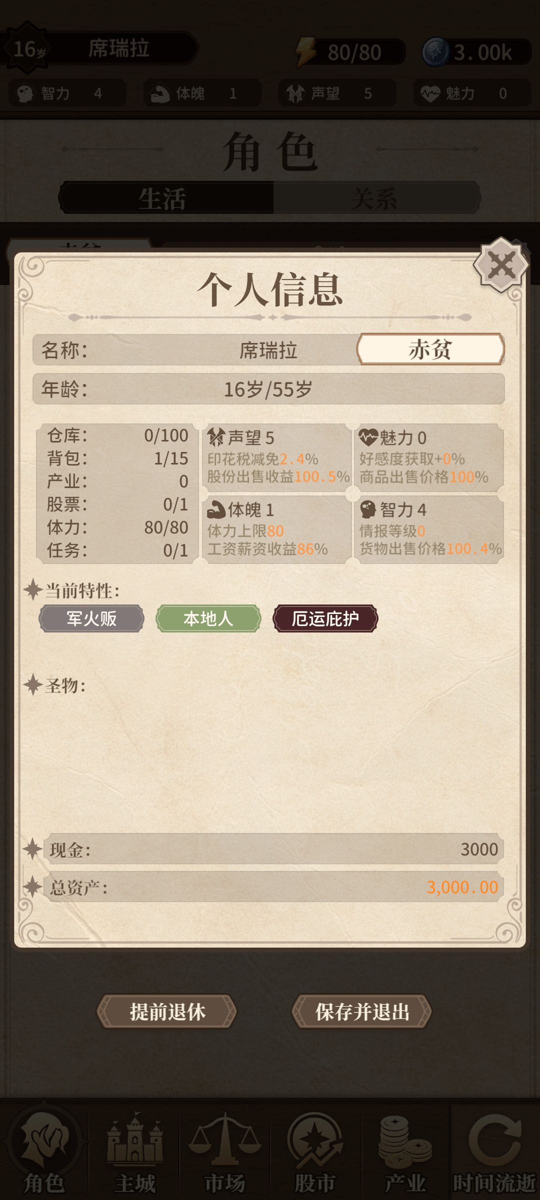 rougelike游戏,每个人生就是一局游戏,16岁开始每个回合一岁,到年龄退休或者破产结束