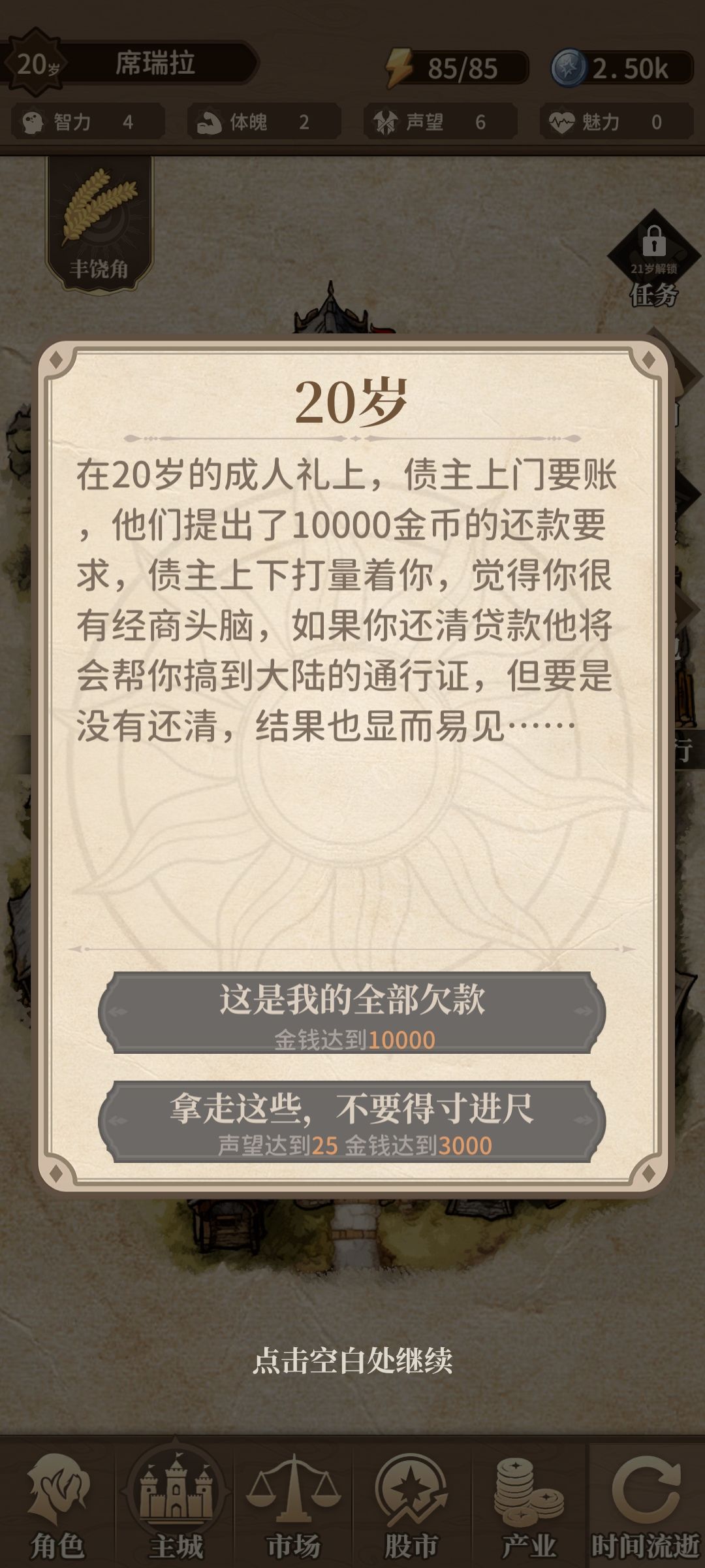 20岁出了新手村,后续每年还会有事件,根据选择和达成情况会有不同走向,和不同的结局,有的事件完不成可能破产或死亡