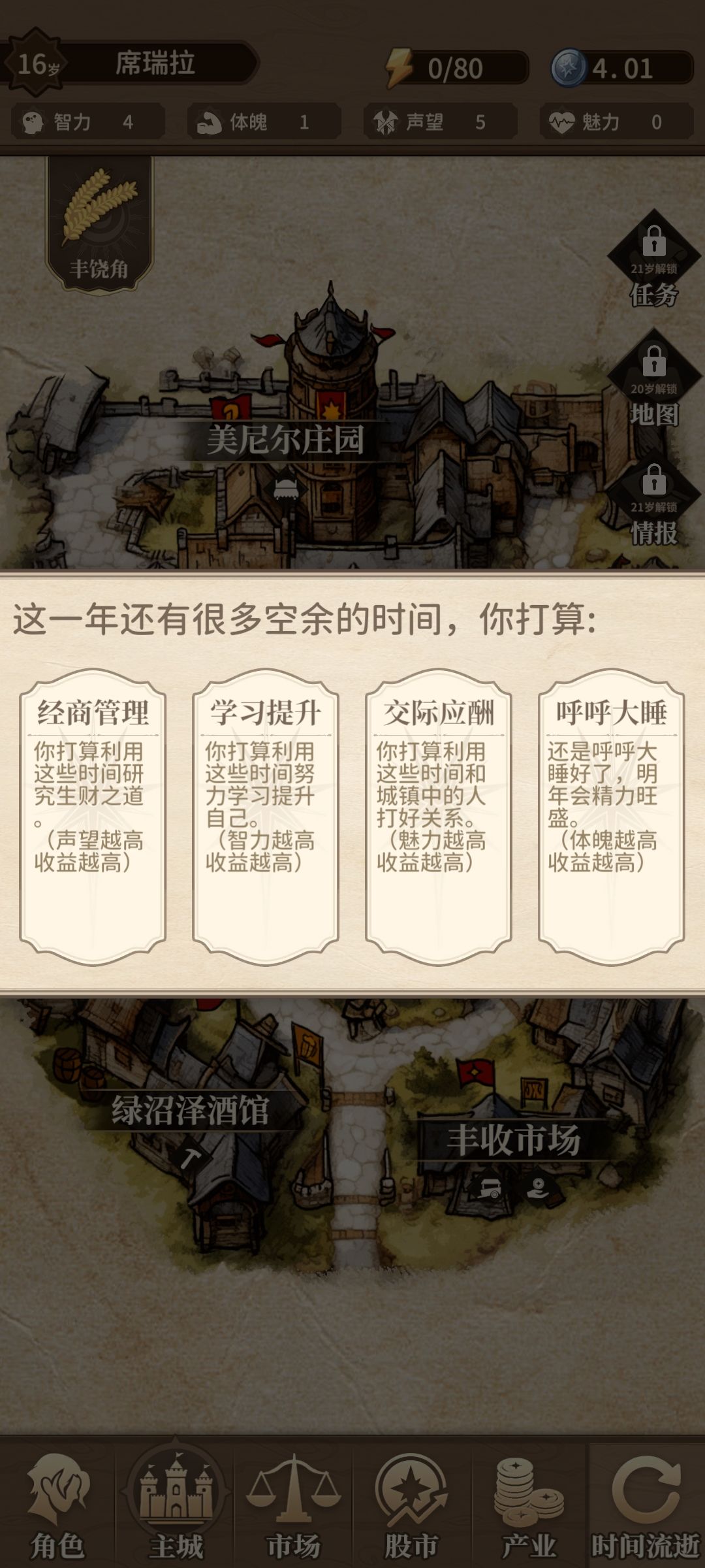 1.打工,体力换银币和好感度,20岁前主要来钱手段,消耗1点行动力