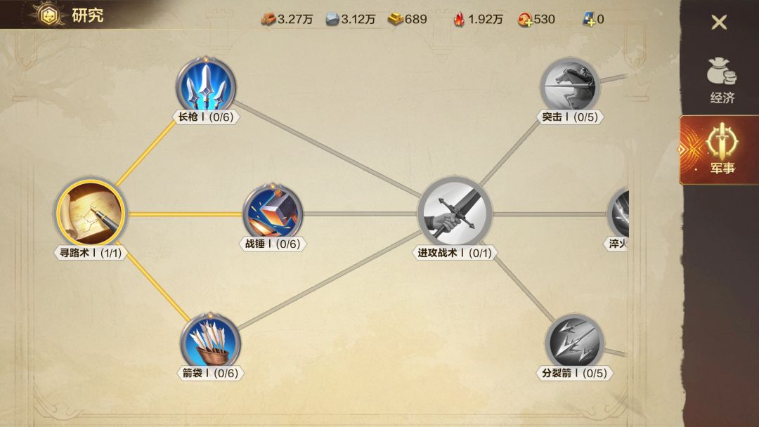 (二)军事科技①、寻路术:提升部队行军速度5%,在激烈的战场中,快速移动能够取得优势,逆袭局势,前期跑图也会比较省时间。②、长枪、战锤、箭袋:分别提升骑兵和战士、护卫和游侠、射手和法师等六个兵种的攻击,防御,生命,这里建议可以优先研究自己核心阵容的科技,最大化提升战力。③、进攻战术:提升部队攻击力,非常有用的军事科技,战力不足时可以考虑提升。④、突击、淬火、分裂箭:百分比分别提升骑兵和战士、护卫和游侠、射手和法师等六种士兵的攻击力,持续增强属性,也是较为有用的科技,特别是后续会解锁二级兵种,建议针对性研究。。⑤、防御战术:提升所有士兵的防御力,前排队伍较多时收益较大。⑥、体能训练:提升所有士兵的生命力,前排队伍较多时收益较大。
