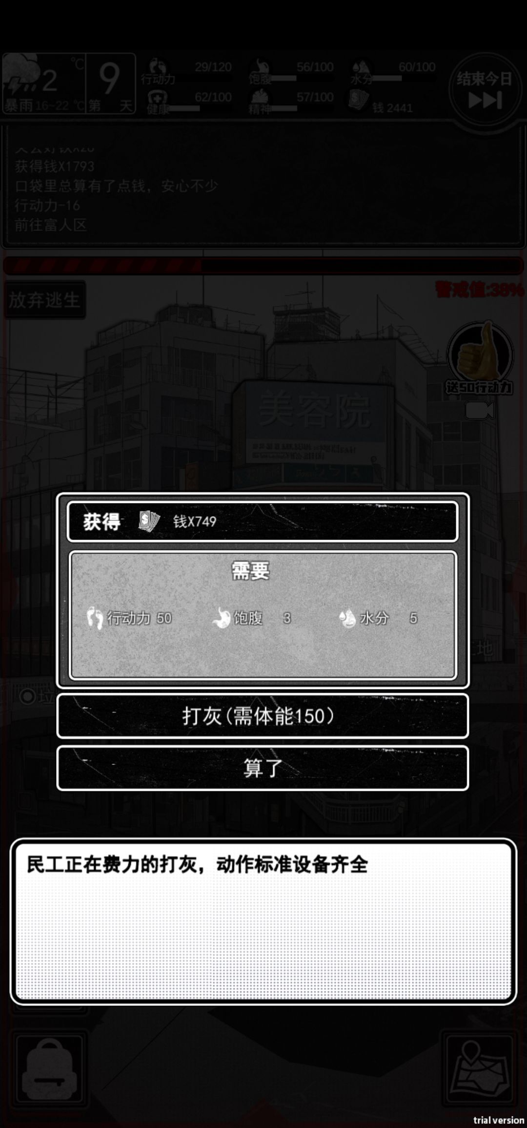 4.富人区修车需50行动,1华子,5饱腹(小卖部便当24钱+7饱腹),2水分(小卖部9钱+3水分),成本核算487。