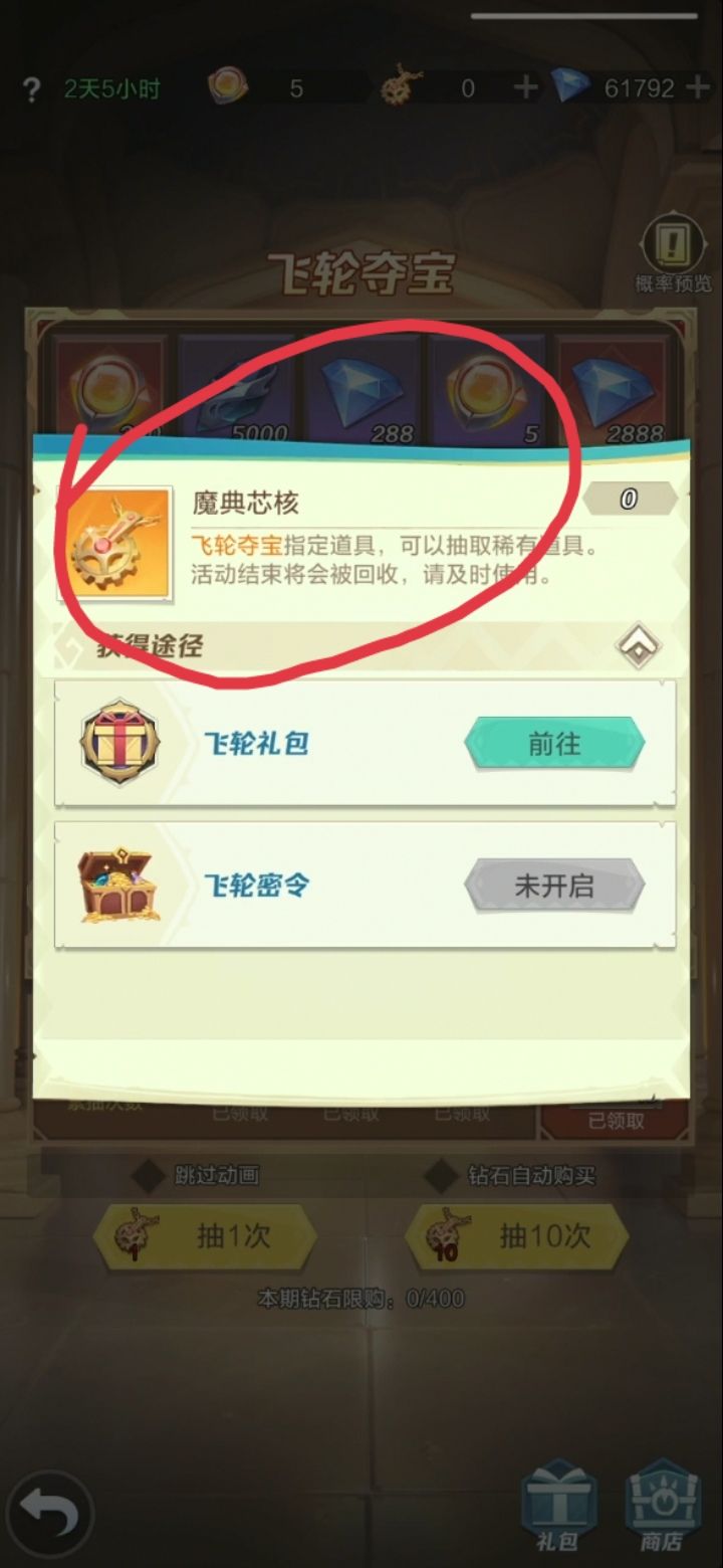 二,【抽奖概率】:试了几个号,200次,花3.5万钻大概可以获得260个【飞轮印信】。400次,花5-7万钻,大概获得540个【飞轮印信】。