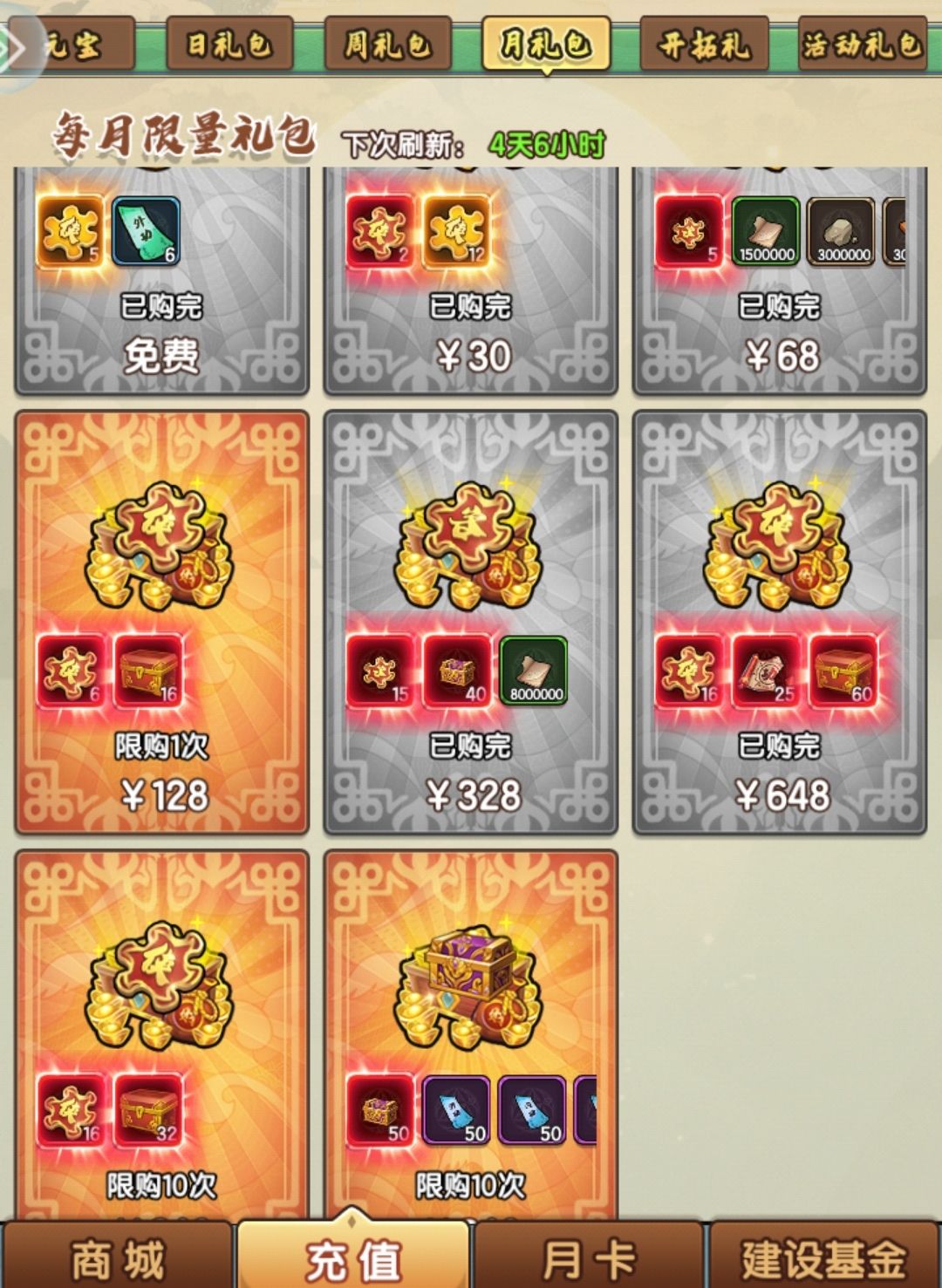 二、在日礼包中,每天可以把6元、30元礼包买了,在前期因为红色客卿碎片基本只能通过氪金获取,并且建设资源紧缺。所以68元礼包也一并收入囊中;同理在周礼包和月礼包中6元和30元礼包需要每周每月购买,68元档前期也无脑收编。这里需要酌情考虑的是月礼包的328元客卿和648元的红侠独门赏赐礼包,性价比还行,收入囊中吧。Ps.在购买礼包之后,会出现一些新的高额礼包,如果是氪佬可以随心购买,但小氪佬就不用买了,性价比不高,看着图个乐就行。三、对于元宝消费,商城的赏赐礼包和建设礼包开局必须可以直接拉满,其余礼包随心购买,包括单卖的内容,酌情看自己心情购买就可以。令牌买到不能买为止