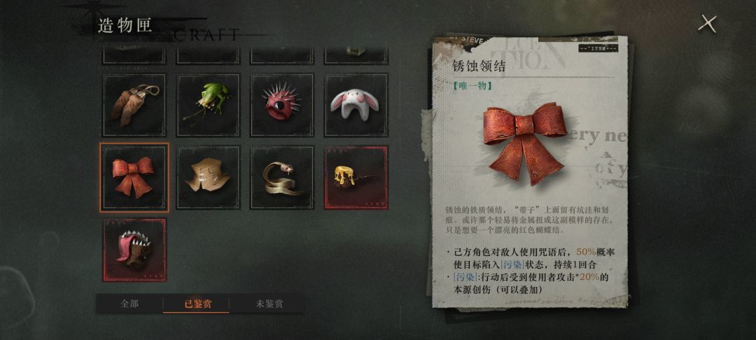 这两件造物只能在事件中获得,锈蚀领结在事件“面具之下”中获得(事件在第一阶段的第5次选择中选“行至途中”触发)