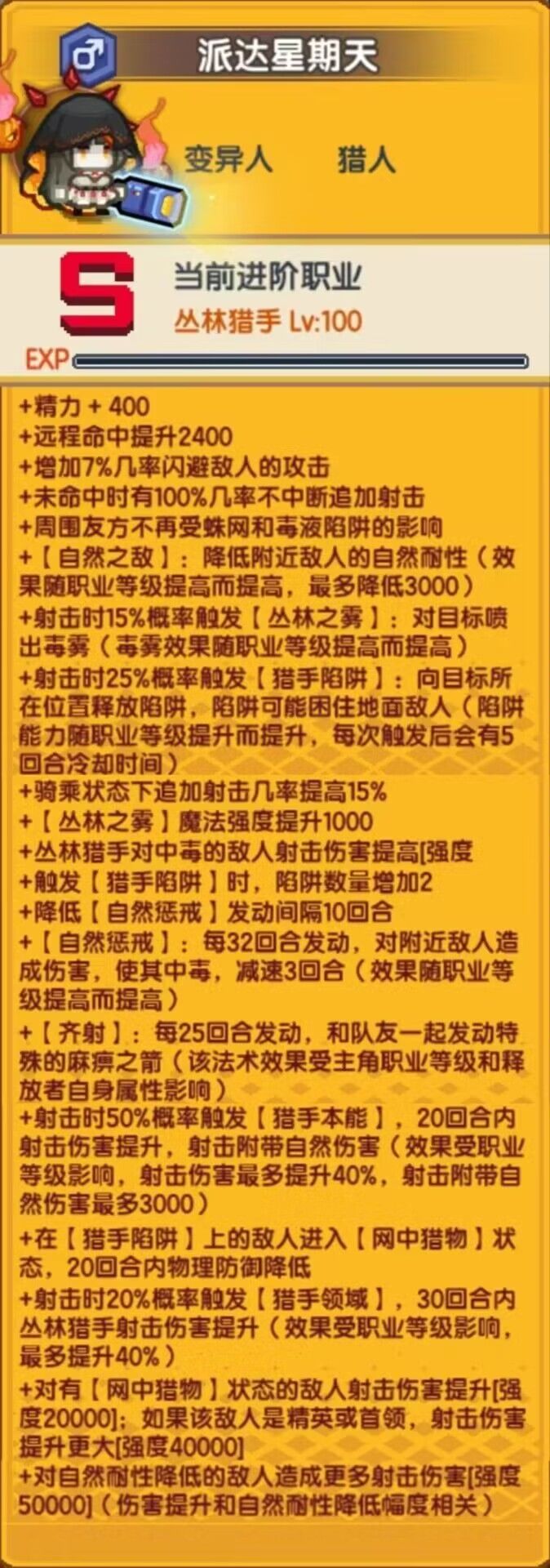 ①精力满级加400,游侠500。