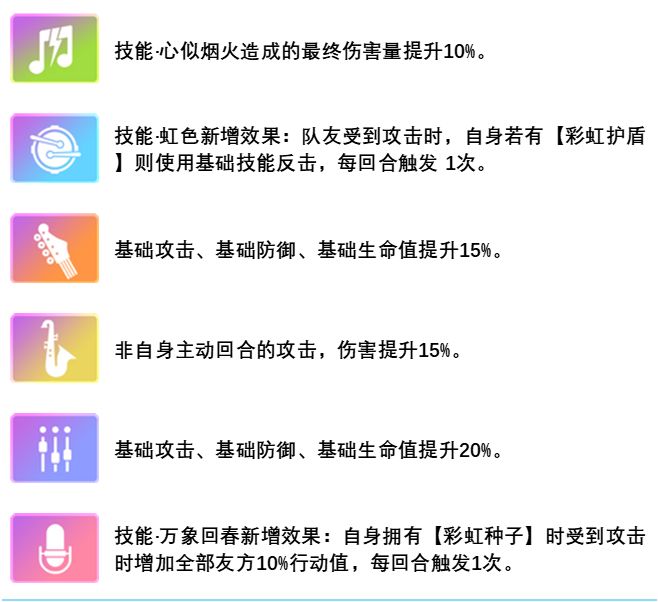 为全体友方附加2回合【暴击伤害提升】和【免疫】,为自身附加5层【彩虹护盾】,然后攻击1个敌方,伤害为自身攻击力的300%,基于自身速度无视目标部分防御。被动效果:战斗开始时获得1枚【彩虹种子】,每触发5次【彩虹护盾】招架效果,额外获得1枚【彩虹种子】。冷却回合:4