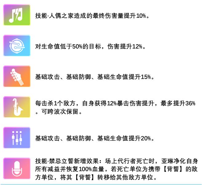被动:敌方每次受到治疗效果后,对其附加1层【背誓】,附加后若【背誓】大于等于7层,亚琳使用人偶之家追击敌方全体,每回合最多触发 1次。背誓受到伤害增加10%,攻击亚琳时暴击概率下降20%,行动结束时随机驱散自身1个增益。最多叠加10 层。