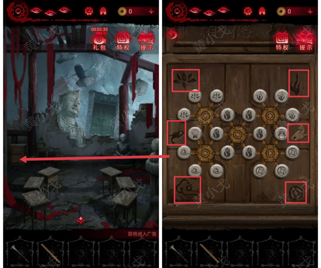 10.(女主-庙)点击功德箱,根据上面的图案提示,完成小游戏