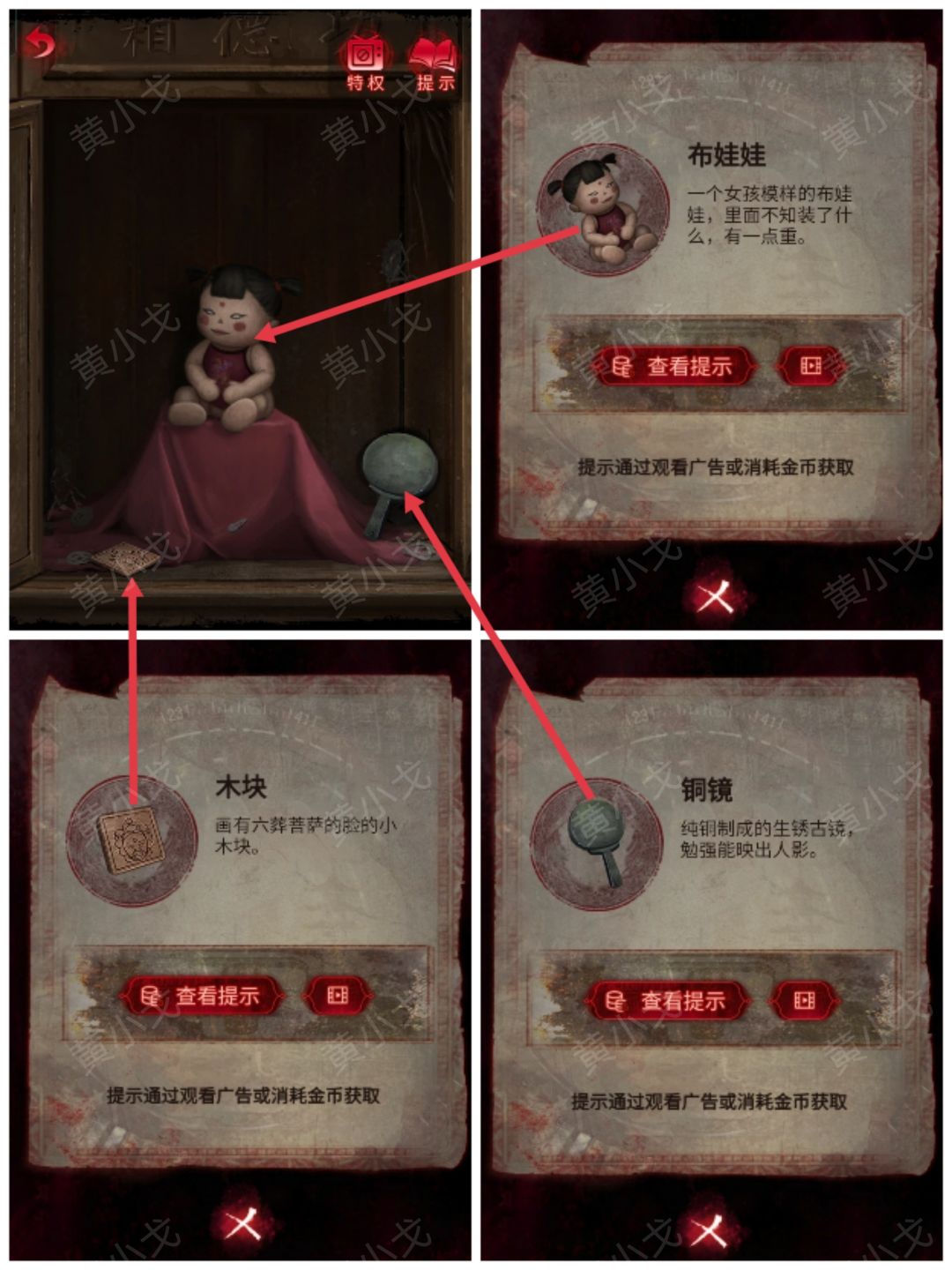11.打开功德箱,获得【布娃娃】、【铜镜】和【木块】
