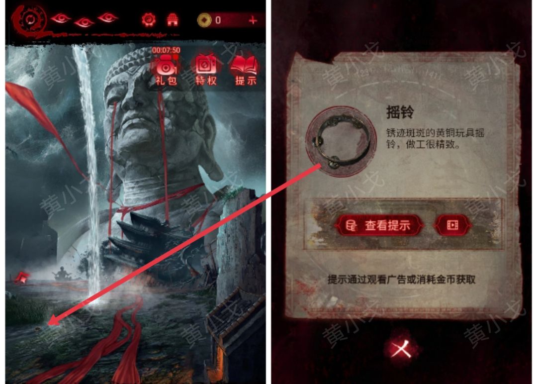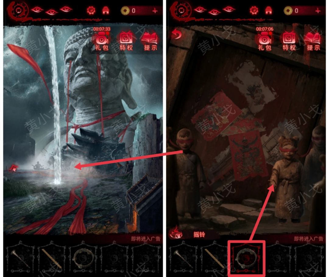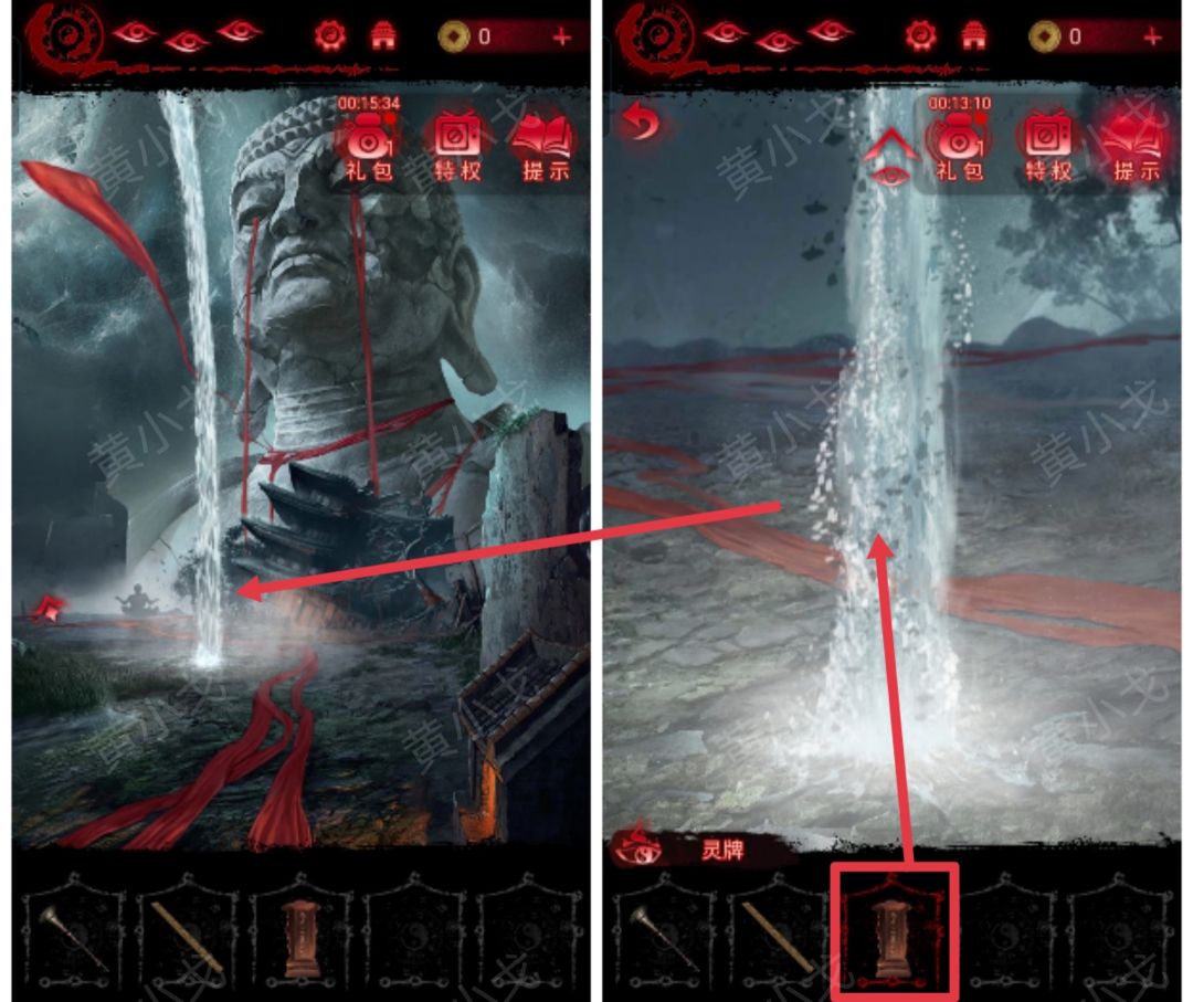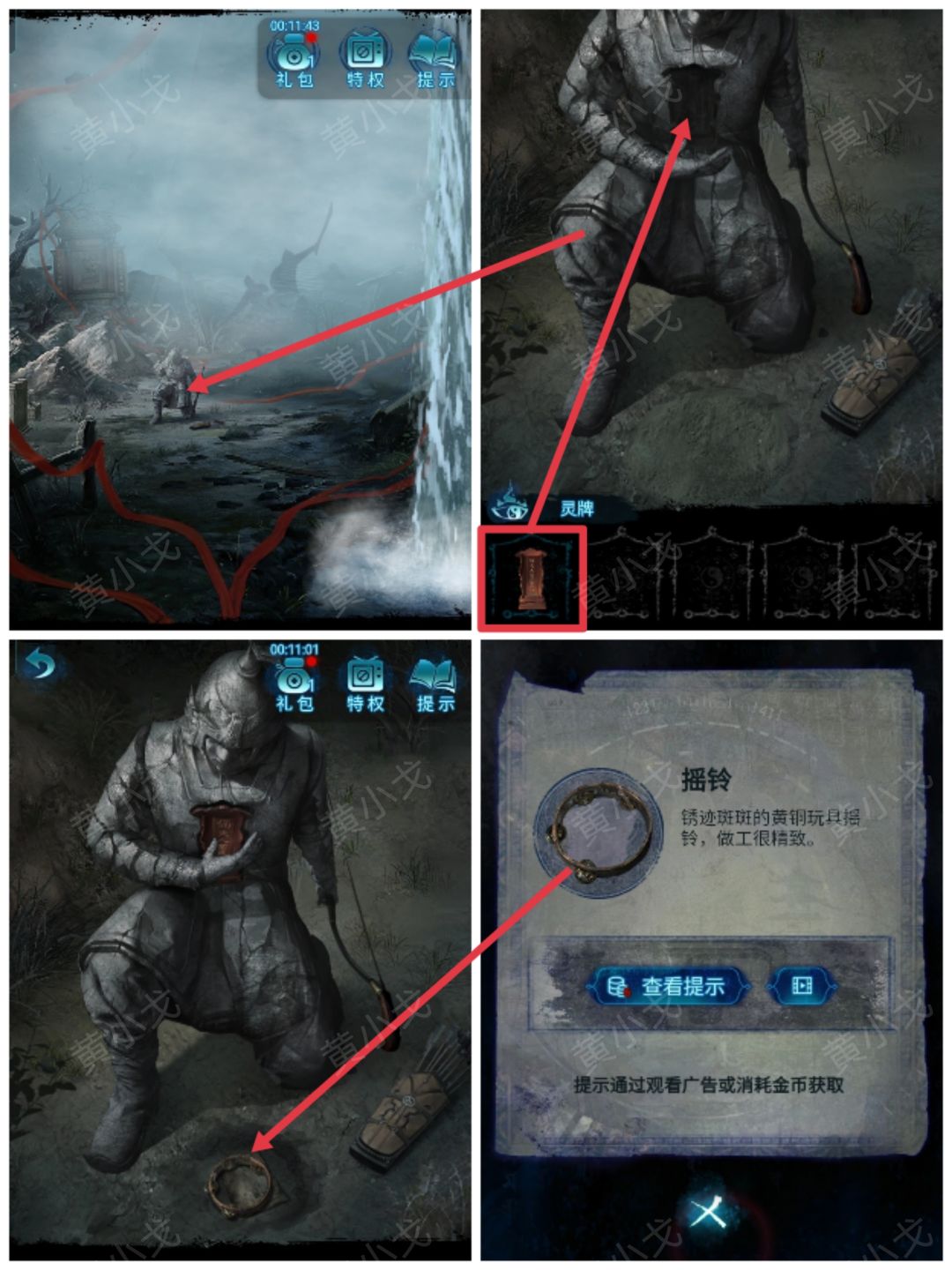 5.(男主-废墟)点击石像,把【灵牌】放入他的胸口,触发机关,获得【摇铃】