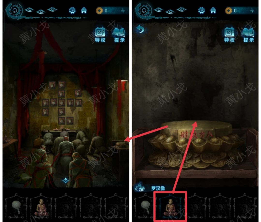 31.(男主-发光房间)点击右边柜子上的底座,放上【罗汉像】
