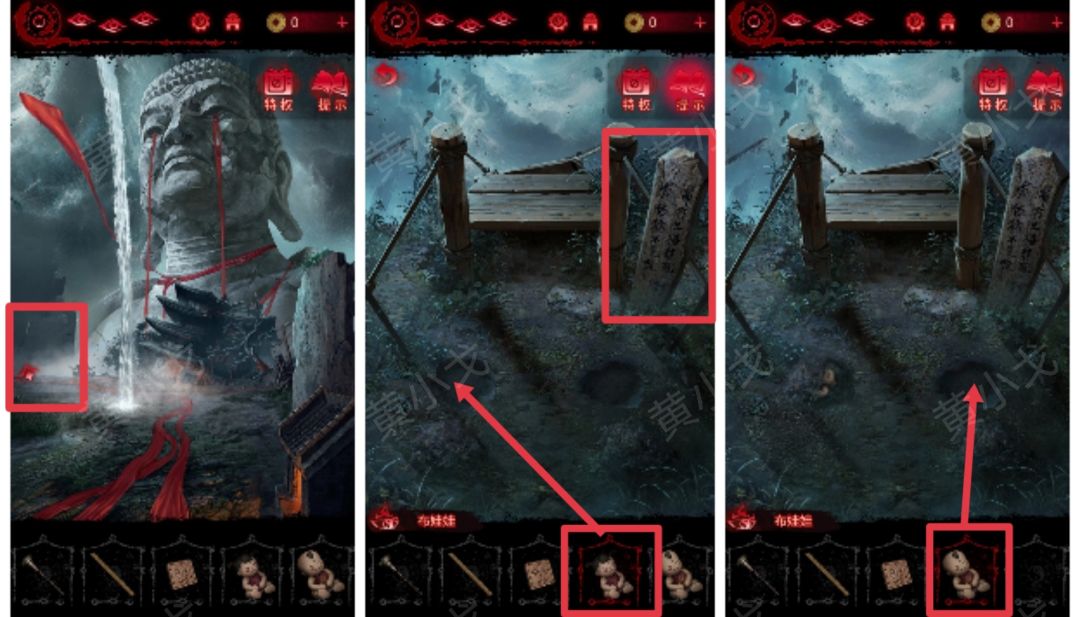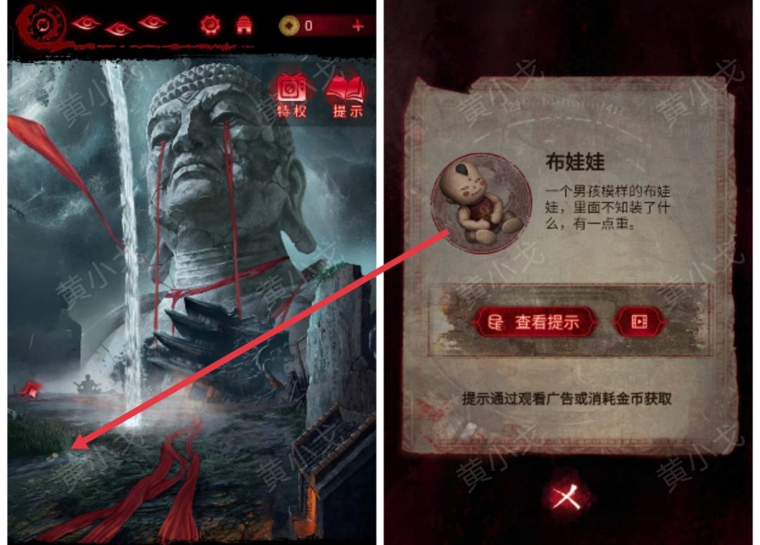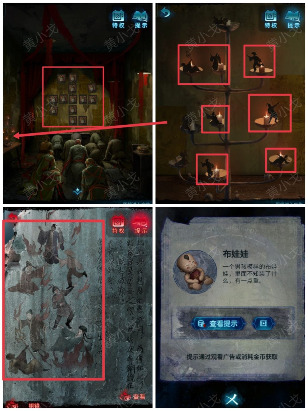 16.(男主-发光房间)点击左边的烛台,根据女主那边的石碑上的线索,点燃对应图案的蜡烛(注意看墙上六藏菩萨画像排列成的图案),获得【布娃娃】
