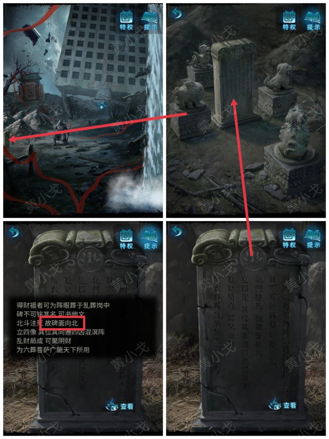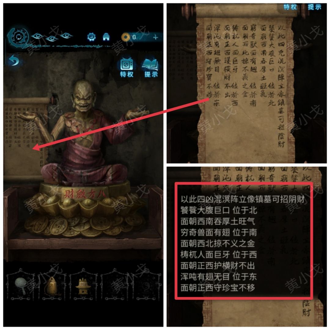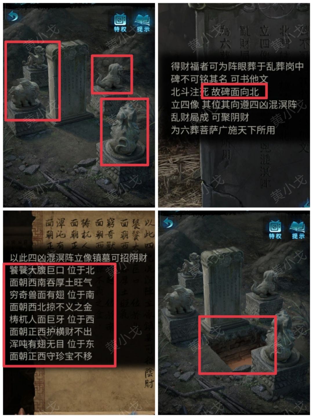 35.根据卷轴上的线索,调整四凶兽石像的朝向(饕鬄-大腹巨口-西南、穷奇-兽面有翅-西北、混沌-有翅无目-正西、梼杌-人面巨牙-正西),破洞