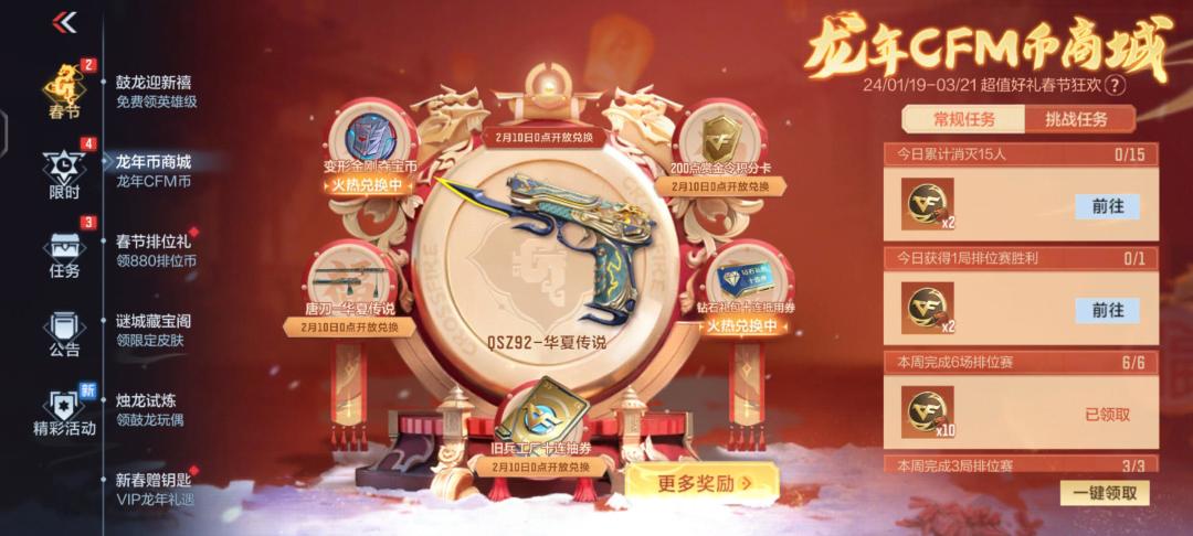 常规任务分为每日任务与每周任务。每日累积消灭15人,或者获取一局排位赛胜利;每周登录一天,或者累计完成三场、六场排位赛都可以获得一定数量的龙年CFM币。全勤的话,一周可以累计获取58枚龙年CFM币。