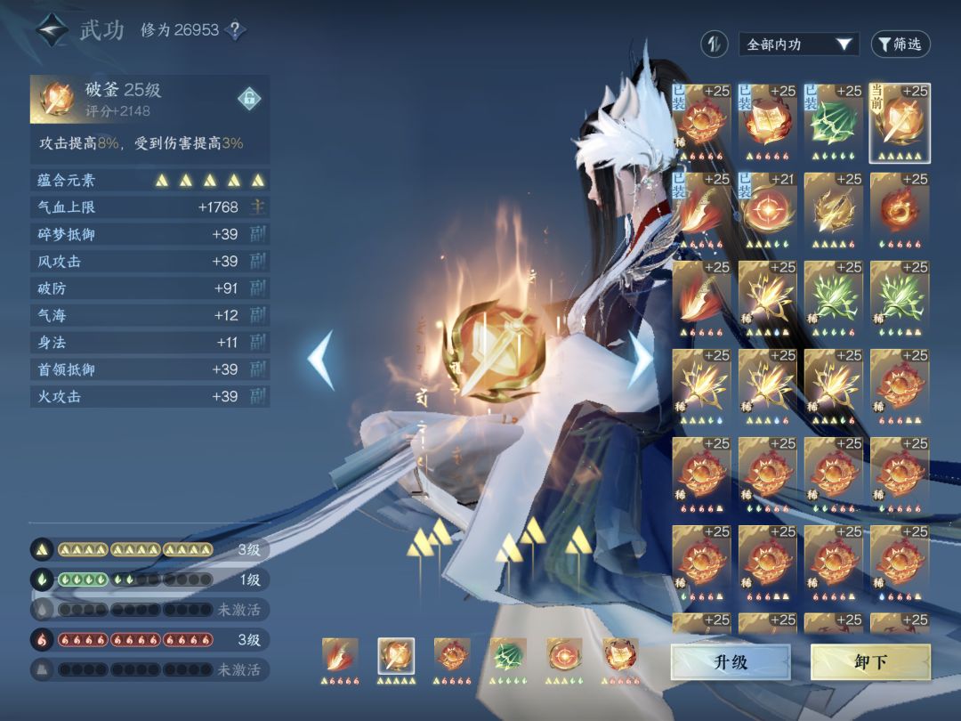 这套内功难凑齐,不能硬凑,要建立在词条好的基础上,凑不来的话也可以考虑破重云和冲虚二选一