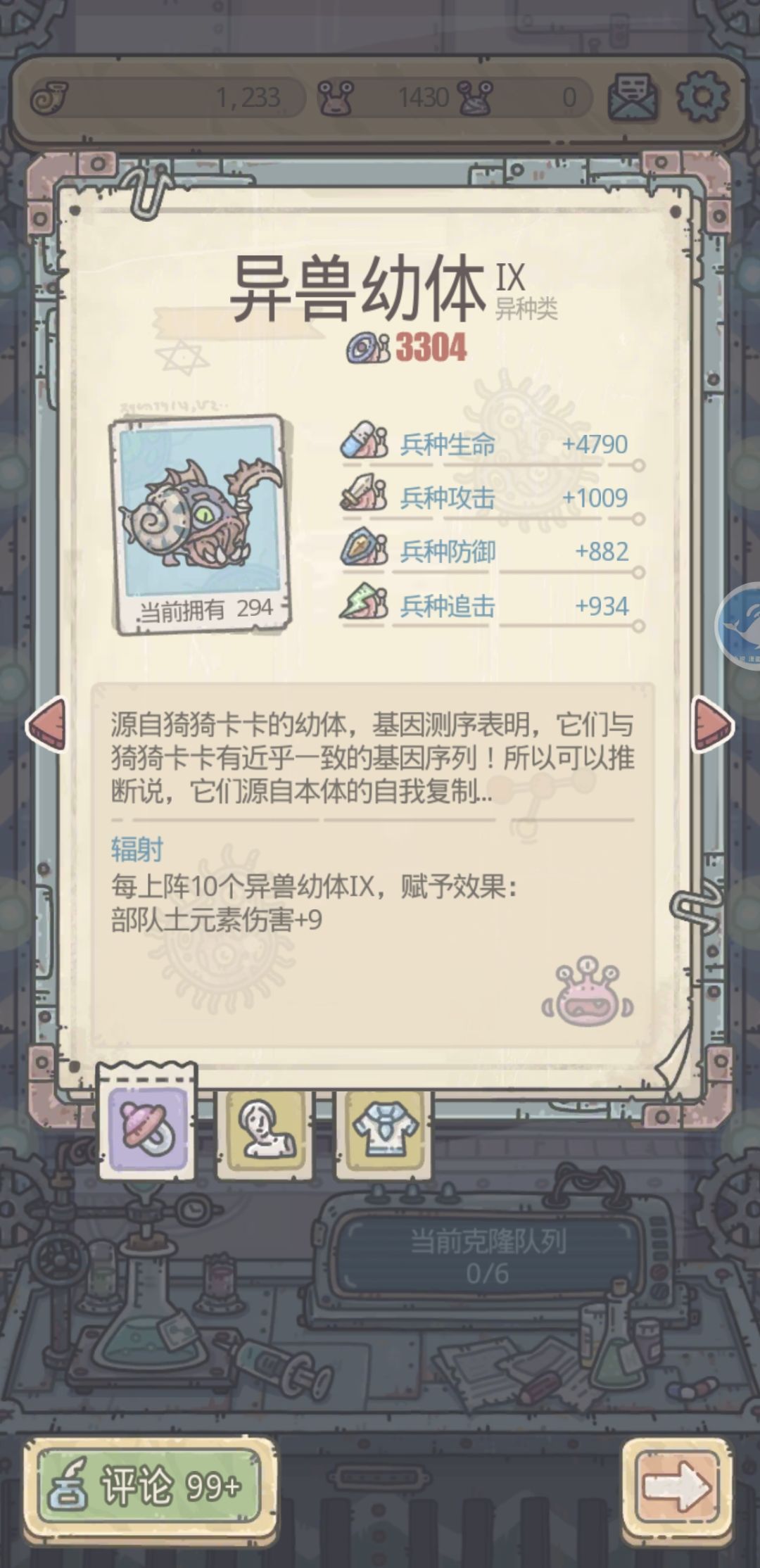 十五天漫长的等待终于九阶了,提升我看到的有以下几点。1.兵种战力提升30w(花了227天克隆加速,单拉了异兽幼崽九阶) 2.兵种可以挖九阶矿了 3.攻击提升了3w(不如七阶龙) 没了,还是在底层