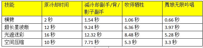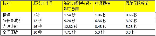 经过极限减少冷却后,超长星波断连续释放技能冷却只有不到 2s ,光遮迷彩技能冷却5.28s 实现常驻,空间压缩技能冷却 3.3s