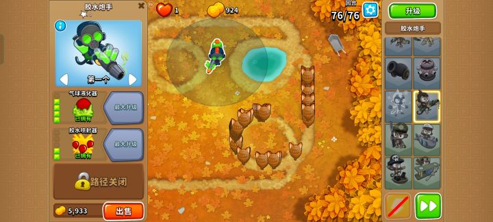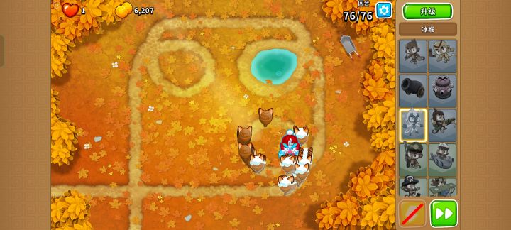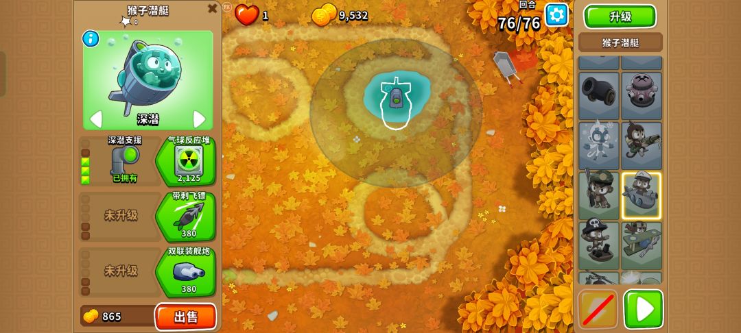 2 在水中尽量靠下放300潜艇,把气球迷彩属性去除之后卖掉,在开头路囗放420德鲁伊。