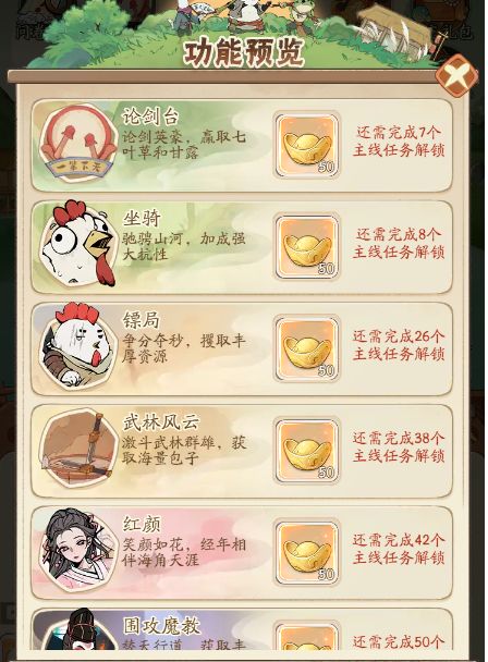 在无名之辈中分别有着:论剑台、坐骑、镖局、武林风云、红颜、围攻魔教、伙伴、门派、飞刀夺宝、侠客、游历、通天塔、钓鱼、徒弟、聚贤集、华山之巅、武学、装备淬炼、恶人岛...等功能玩法