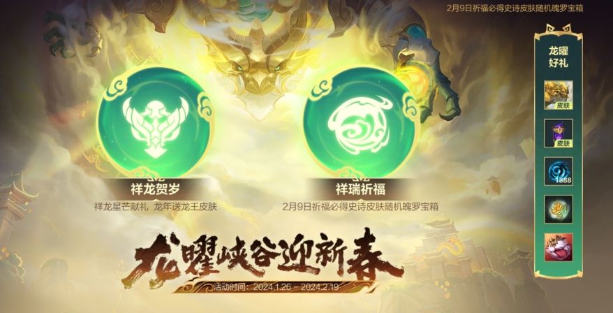 春节重磅福利活动“龙曜峡谷迎新春·祥龙贺岁”正在火热开放中!召唤师记得完成对应任务,免费领取“东恒之曜 奥瑞利安·索尔”皮肤,以及多款龙年主题个性化道具等丰厚奖励哦!