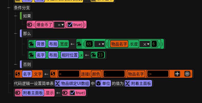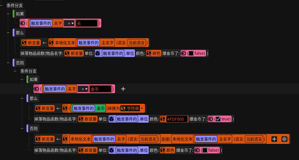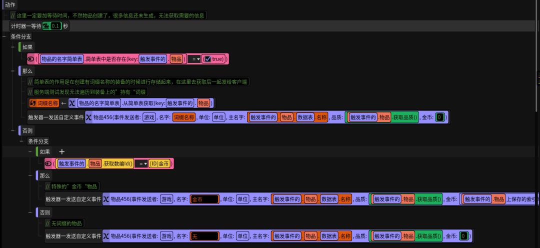 因为金币是自动获取,且金币是获取生效的物品,不会在背包里产生物品,所以无需有等待时间,而其它物品需要等待0.1秒后进行销毁附着UI,删除元素,因为玩家背包存档的物品在上线后还原物品也属于创建和获得,会让触发很快跑了一遍,如果没有等待时间,会出现玩家上线后当前坐标处会有很多背包里物品的附着UI,而0.1秒就是为了等待它创建再来删除。