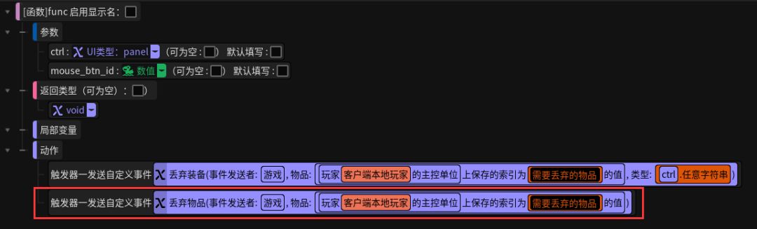 那么丢弃物品在地上时,将没有名字,我们可以在丢弃按钮写一条客户端触发,不需要发送给服务端。