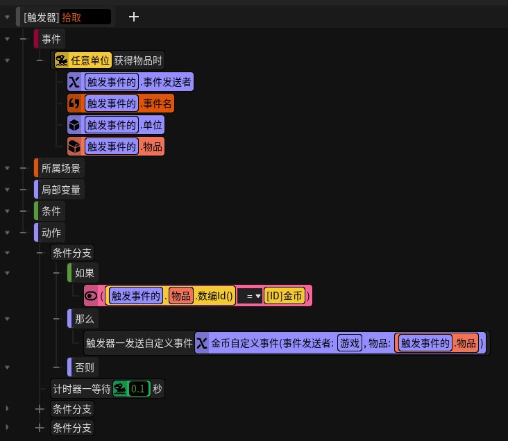 最开始我用拾取效果里连接修改单位自定义属性效果,发现一直研究无法解决金币创建时的金币数量,那么只能想另一种方法来实现。