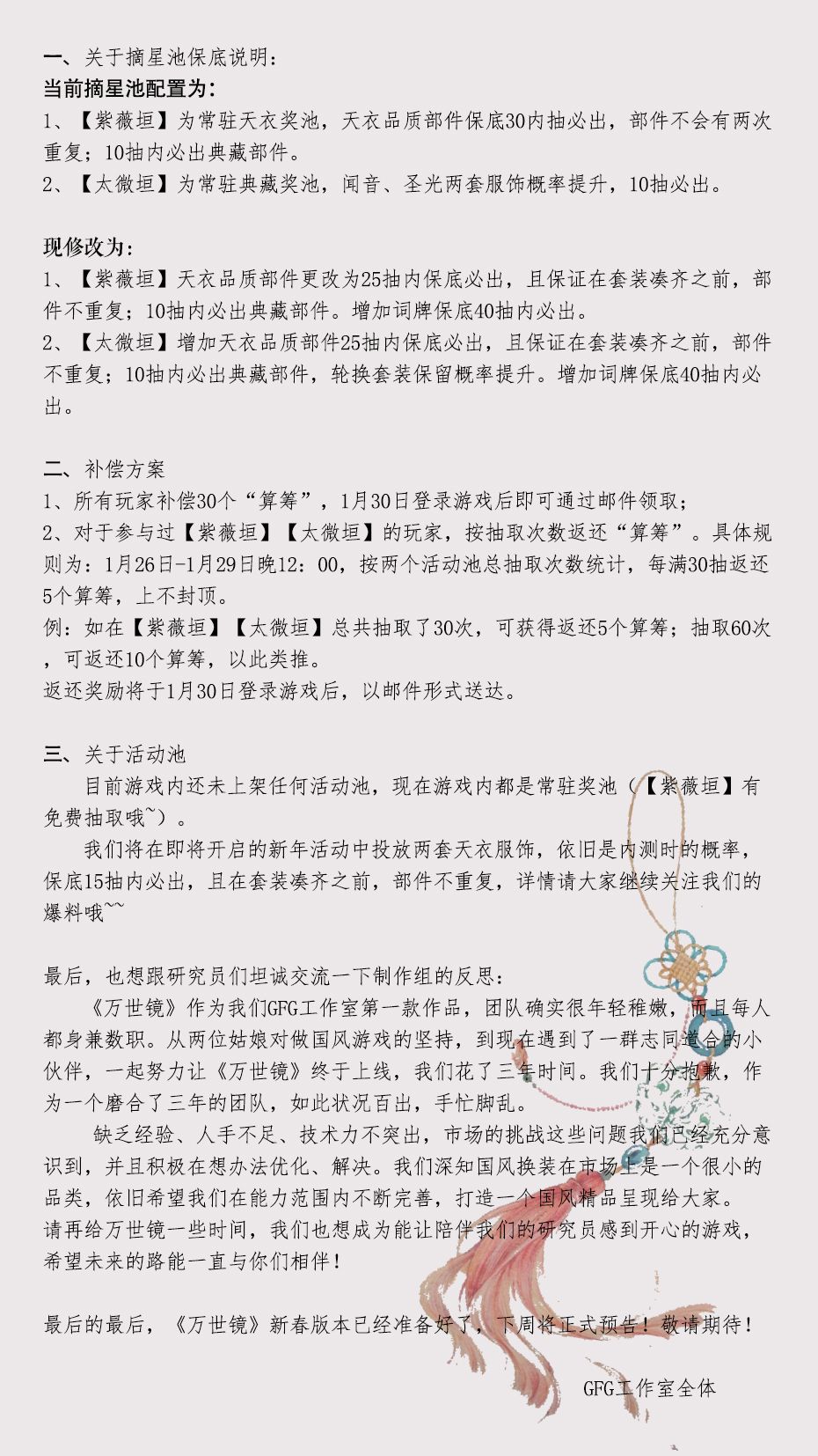 《万世镜》作为我们GFG工作室第一款作品,团队确实很年轻稚嫩,而且每人都身兼数职。从两位姑娘对做国风游戏的坚持,到现在遇到了一群志同道合的小伙伴,一起努力让《万世镜》终于上线,我们花了三年时间。我们十分抱歉,作为一个磨合了三年的团队,如此状况百出,手忙脚乱。