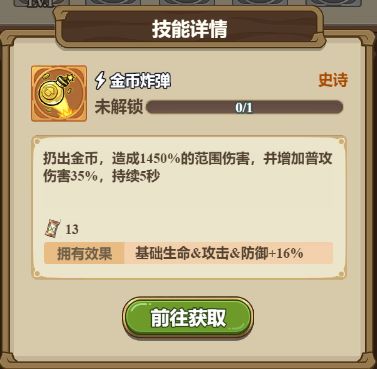 技能描述:扔出金币,造成高额范围伤害,增加其百分比普攻伤害,持续5秒。