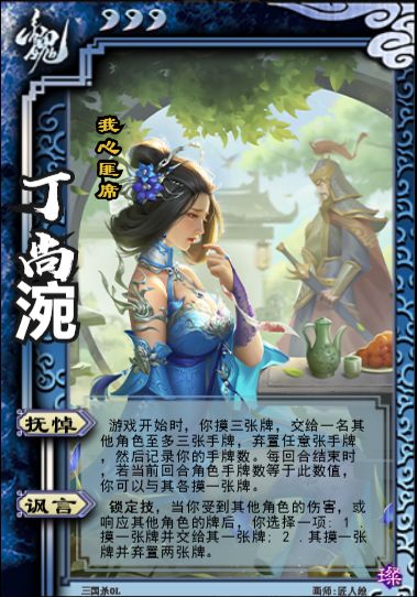 丁尚涴抗压能力很强,当主能有四血,有一定的防御能力,做主公能活着最主要,这就需要忠臣有一定的输出能力。