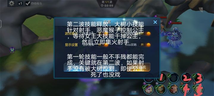 如图,技能先放大树小技能,然后紧接着女王小技能链接刺客,其他英雄释放技能见图1,然后等女王大招出来先把刺客秒了,恶魔猴子技能快速释放,不用选人。只要大树暴毙或者女王没有秒掉刺客,立即重来不用纠结。第一波技能释放完毕后,大树小技能针对后排射手,恶魔和猴子技能针对公主让它眩晕,女王紧接着小技能再链接公主,等大招恢复把公主秒了基本就差不多了,如图2,重点就是大树的技能必须成功打断射手大招,否则有可能公主死了但射手开启了大招导致团灭。