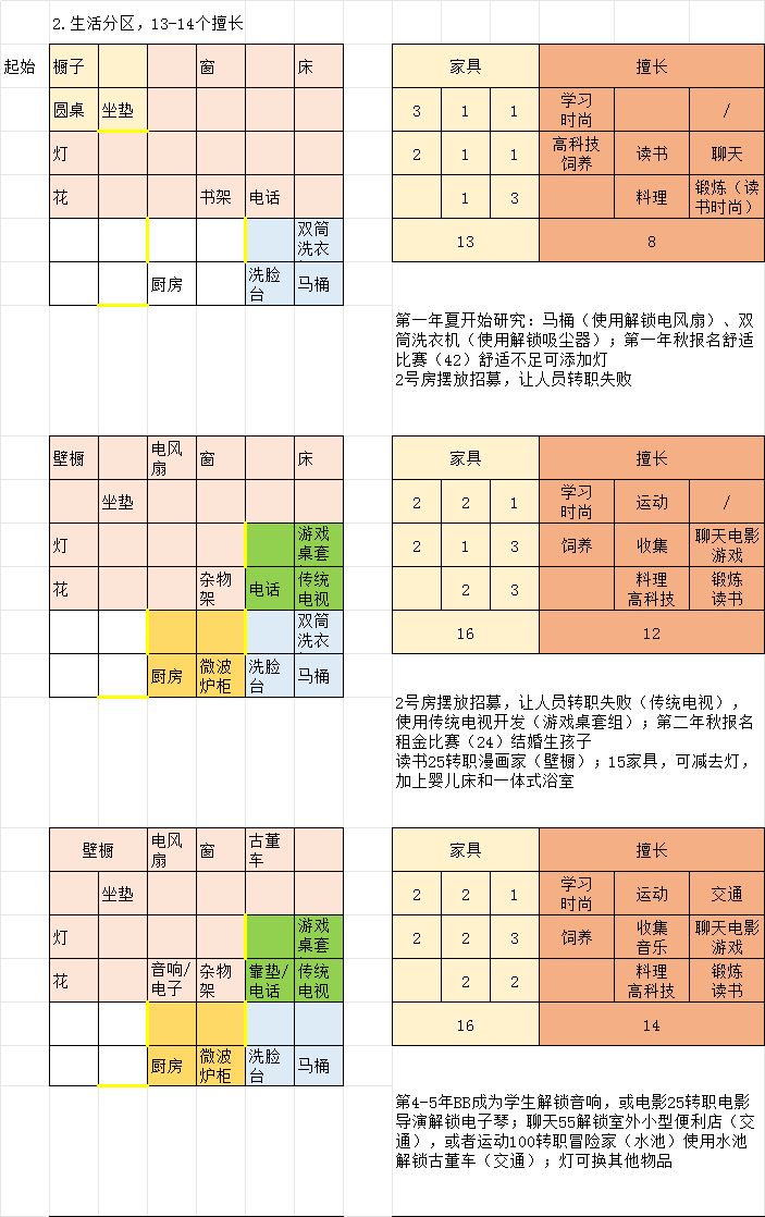 家具和职业解锁都跟擅长有关。所有家具或多或少都有添加四大属性,所以优先考虑满足14擅长,其次是舒适度,还有分区。