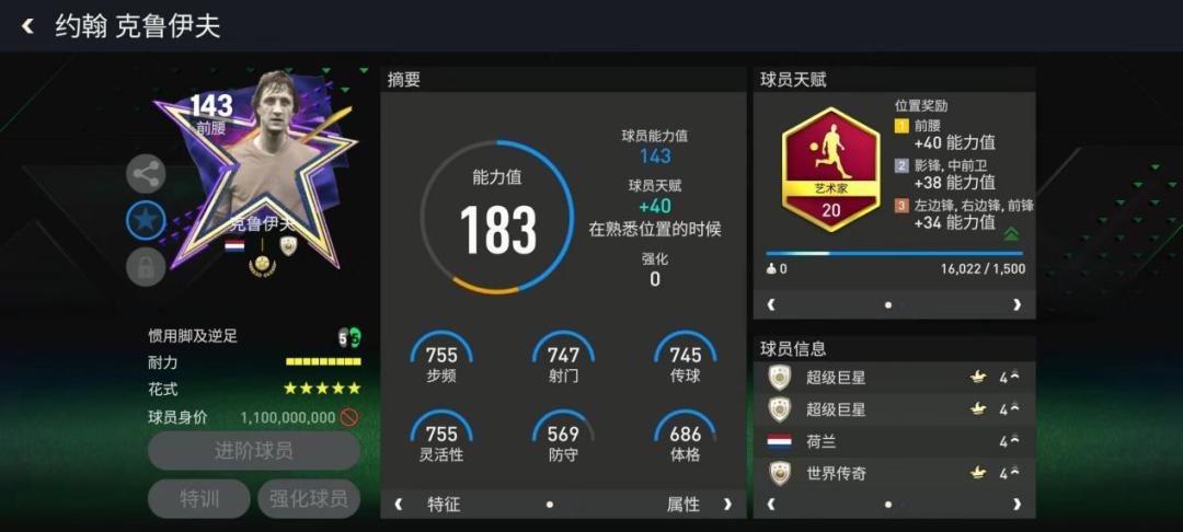 队长克鲁伊夫给到了143的基础能力值,各项进攻数据都在750左右,配备艺术家天赋后,他的传球能力与灵活性得到了进一步加强,五星花式搭配九格耐力,在实战中极具威力。
