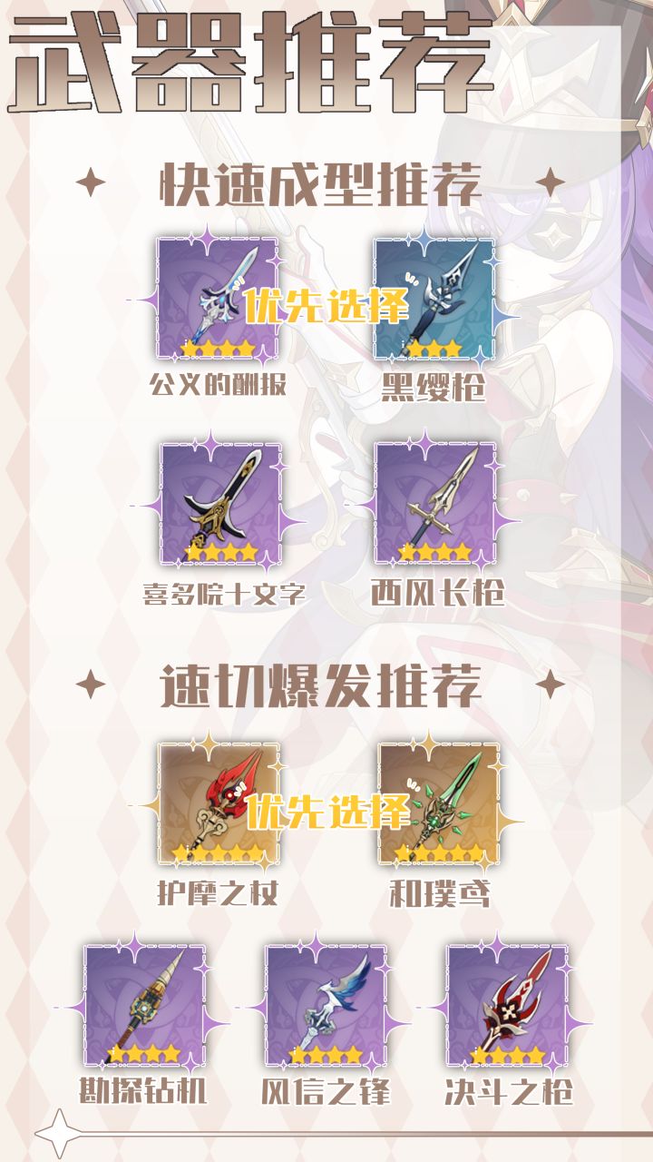 推荐:分快速成型与速切爆发,考虑到一般5星武器都是给5星角色用,这边最优解还是4星武器“公义的酬报”,各个属性都很符合她,并且入手简单,容易满精,同时对于全走生命流的夏沃蕾来说,同样是首选。