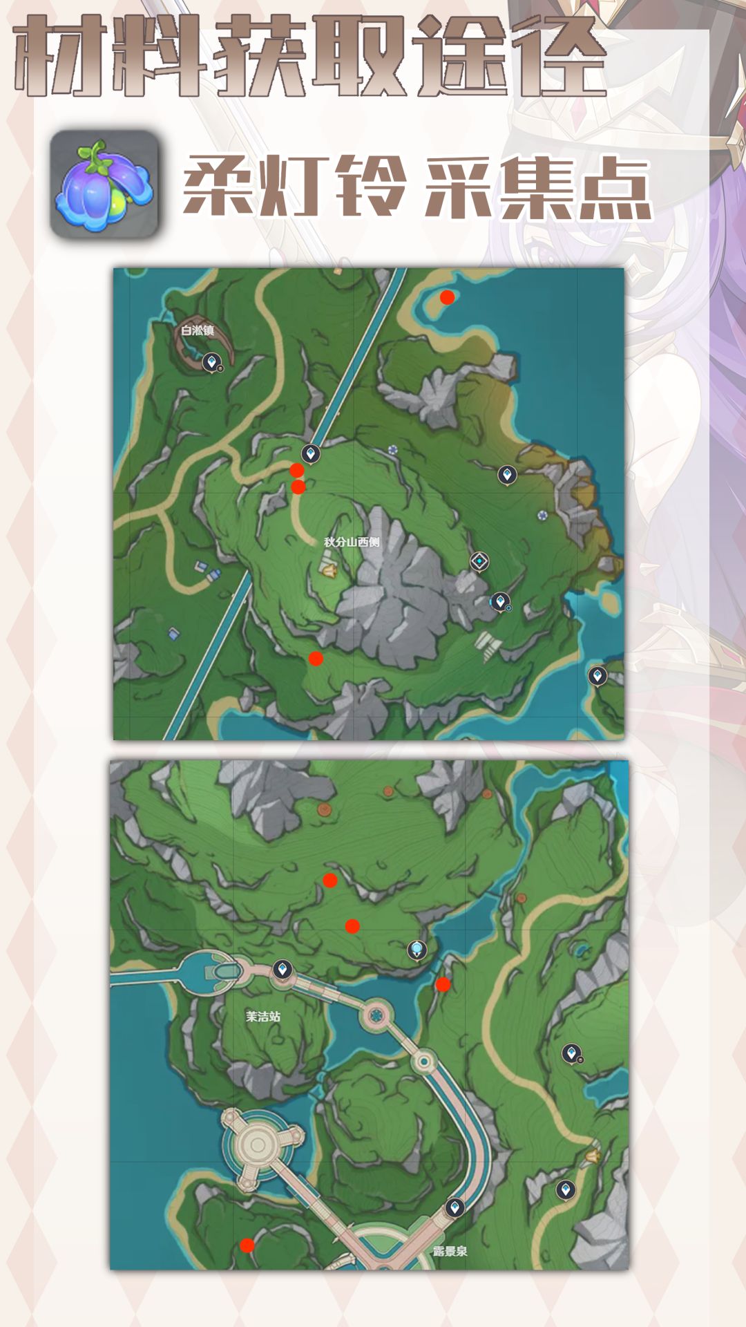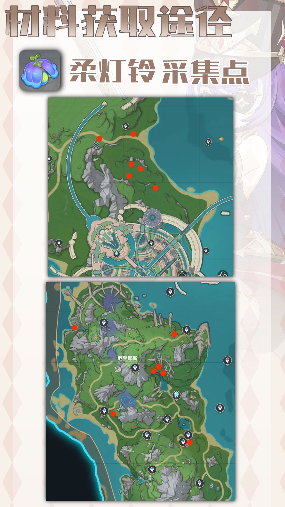 2,柔灯铃:标注了部分数量比较多的区域,这个材料本身还是挺常见的,也可种植获取。