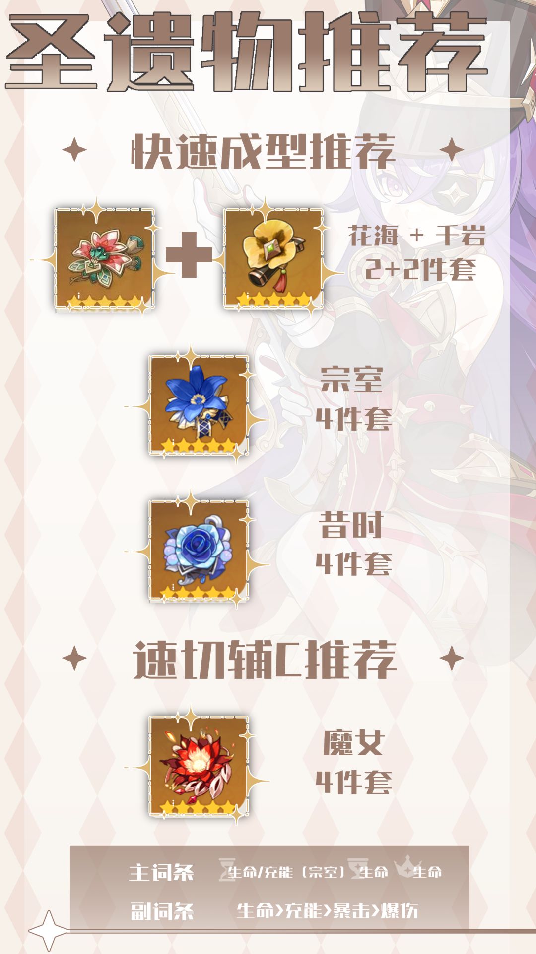 主推生命的可以选择2千岩2花海,主推充能的4宗室,这2个组合都属于能够快速成型的,然后走速切流的也可选择魔女4件套。