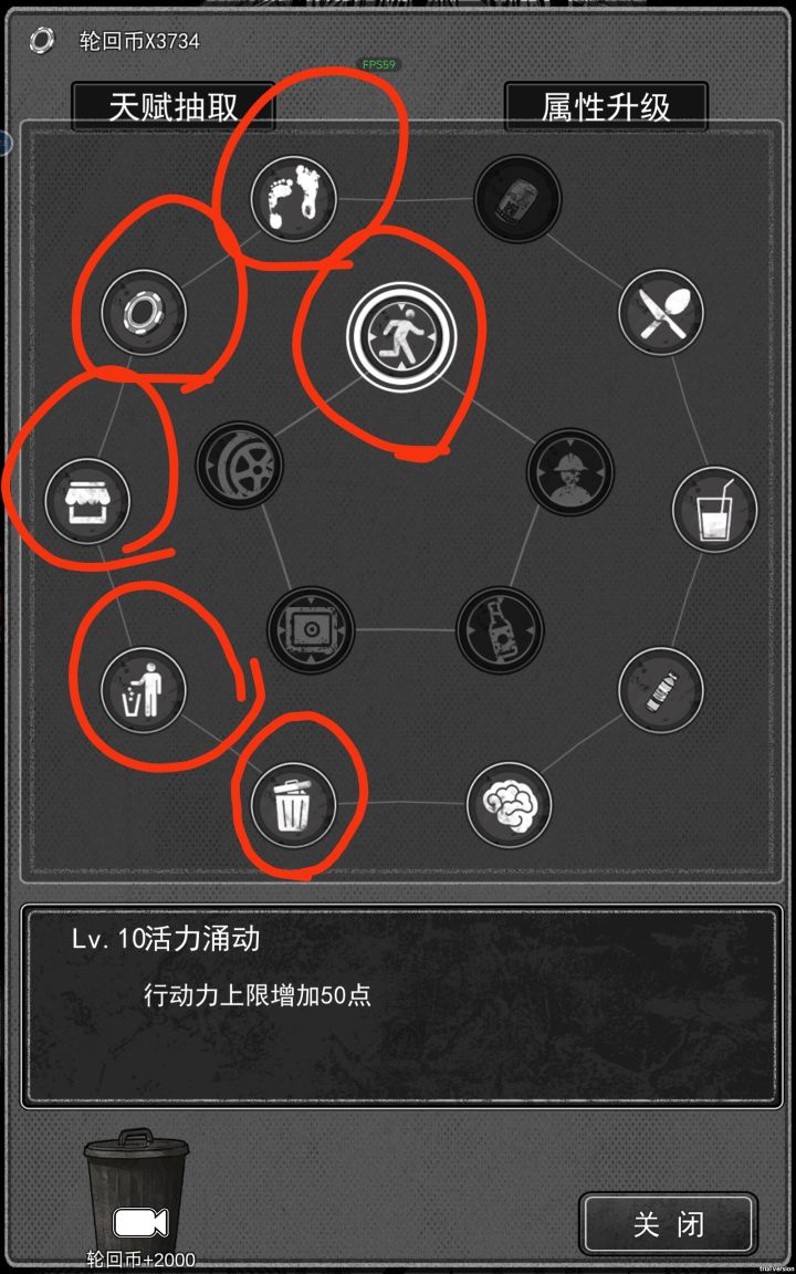 二,关于如何点天赋:首先可以把加轮回币的那个点满了,然后就用连点器一直刷,刷完轮回币之后最好就是先把我圈红的那几个点了,然后没标红但是亮着的就可点可不点。(毕竟有钱了囤的东西多点也就行了)