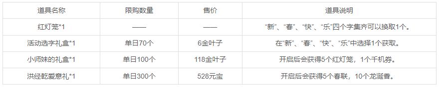 活动期间,通过“江湖磨砺”挂机,在挂机次数内必定掉落“新”、“春”、“快”、“乐”集字道具中其中1个,集齐四个字可兑换道具“红灯笼”,收集“红灯笼”可以兑换各式好礼。