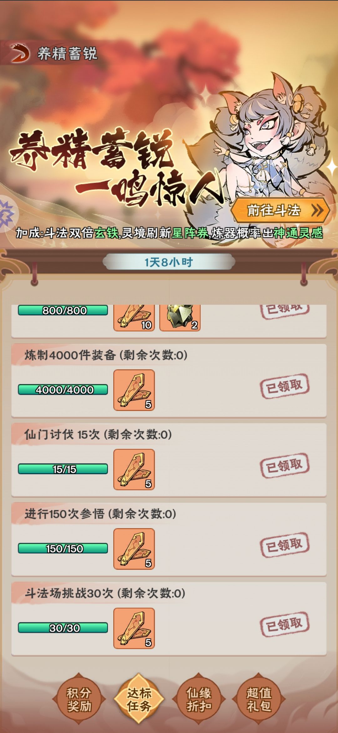 活动期间有特殊加成,斗法可以拿到双倍玄铁,所以这期间去开炼器宝箱拿斗法券很赚,另外炼器可以出神通券,所以提前存一些炼器宝箱也很值,还有就是灵境在活动期间可以产出星宿符,大家记得去抢。