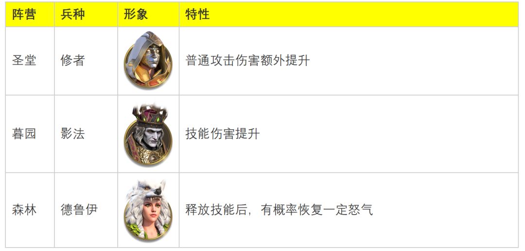 ①法师英雄以技能伤害为主,圣堂法师特性提升有限。②暮园法师特性提升技能伤害,与法师阵容完美契合。③森林法师特性的回怒效果,可以提升队伍技能释放频率,对于依赖主动技能的英雄增幅极大。专精英雄