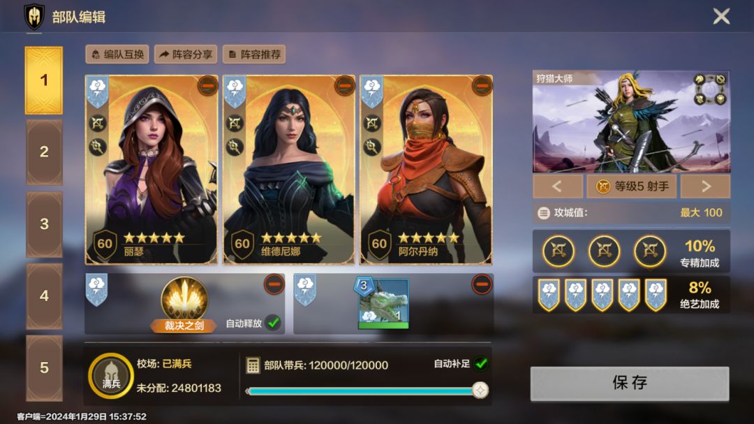 - 进阶阵容,可获得全额兵种和绝艺属性增幅,丽瑟可以通过首充或直购获取,维德尼娜可以用艾德里得替换,较为容易构建。