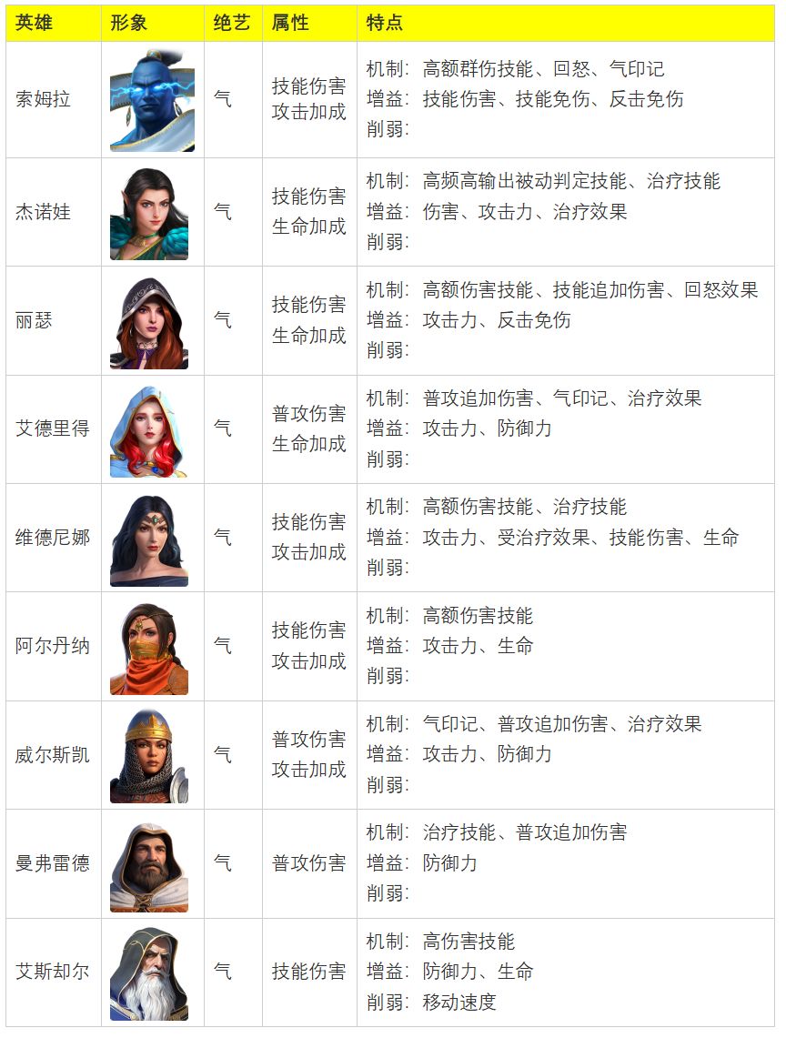 - 裁决之剑、影龙、索姆拉都可以为队伍添加气印记,显著提升队伍攻击力,提升伤害并能强化英雄技能效果。