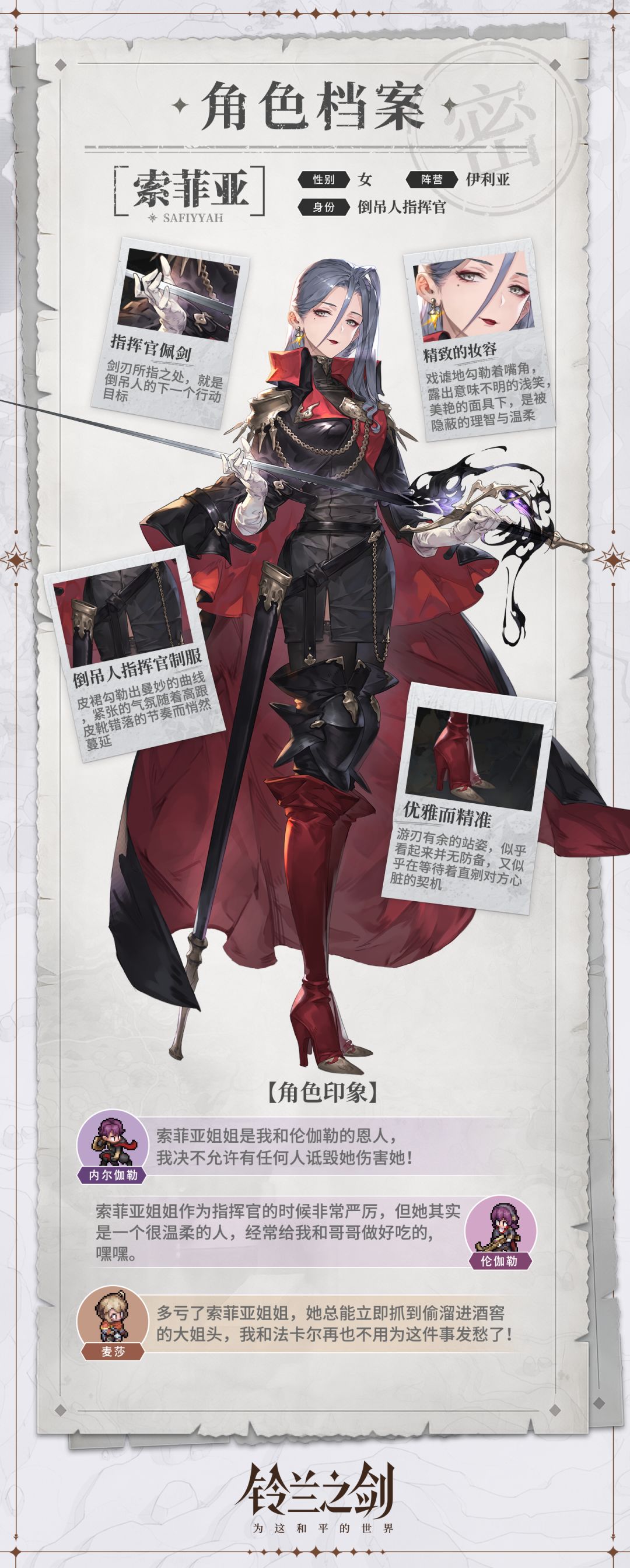 心思缜密、杀伐果决的倒吊人最高指挥官,为守护伊利亚可以不惜一切。她坚韧的理智和温柔,总是藏匿在美艳而危险的面具之下,正如她内心的善良,从未因为身处黑暗而动摇丝毫。
