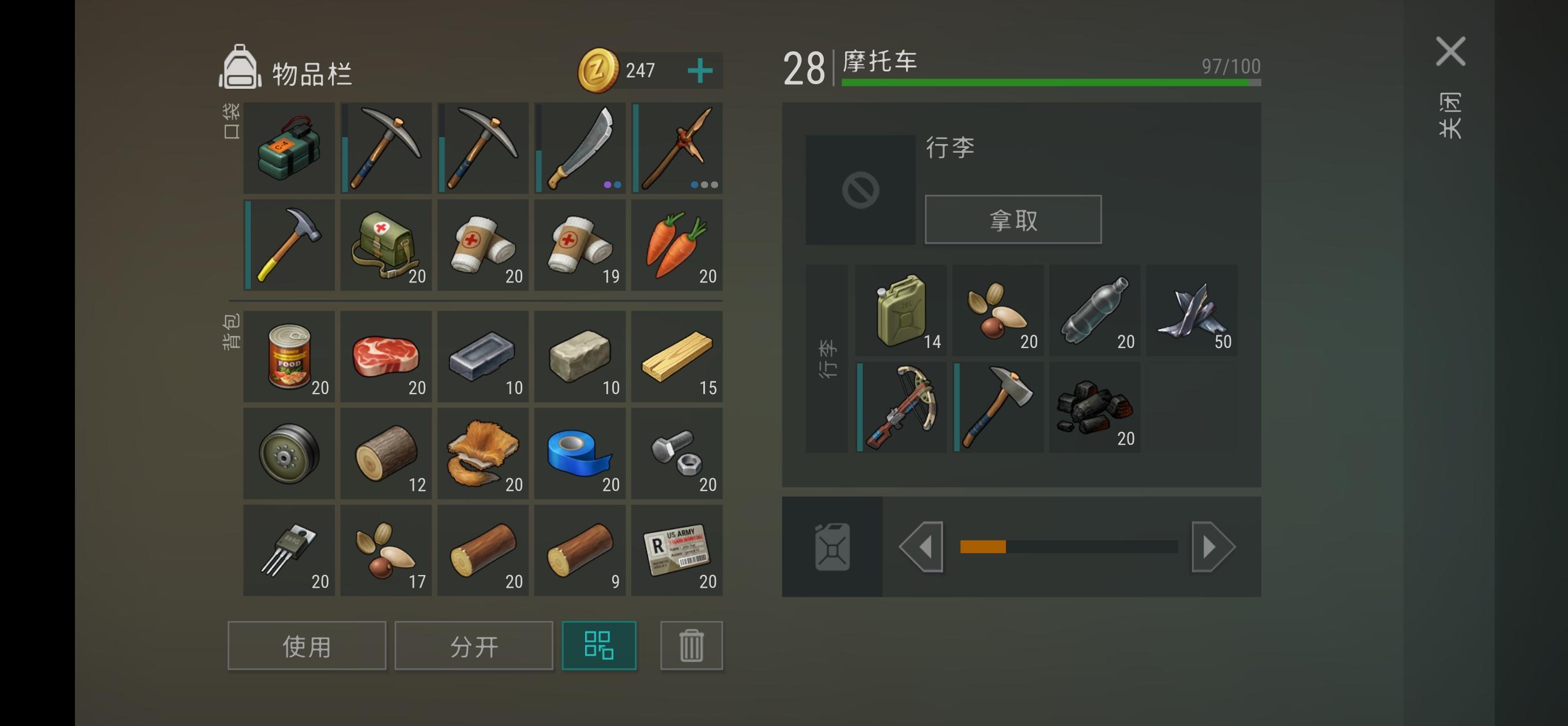 总收获如下:背包下边四行是从这家里边拿的,有两组绷带一组大包还算不错,摩托里边种子、煤、铁屑是抄的