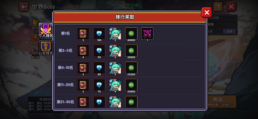 世界boss,每周奖励可领取2次,排名奖励跟大秘境一样,也是职业榜就可以吃满奖励了
