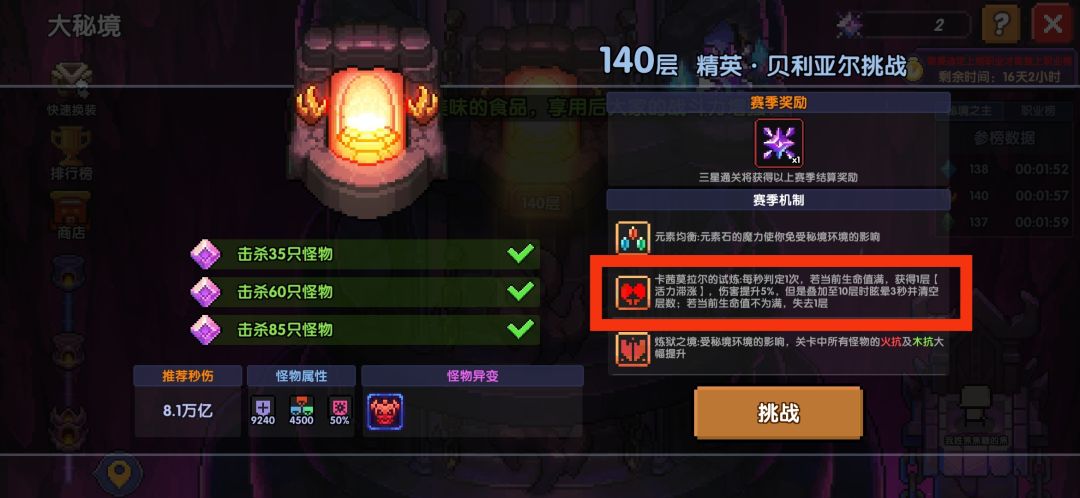 在魔王秘境的129、130、139、140层,会引入更为强力的精英怪(如图中的贝利亚尔)