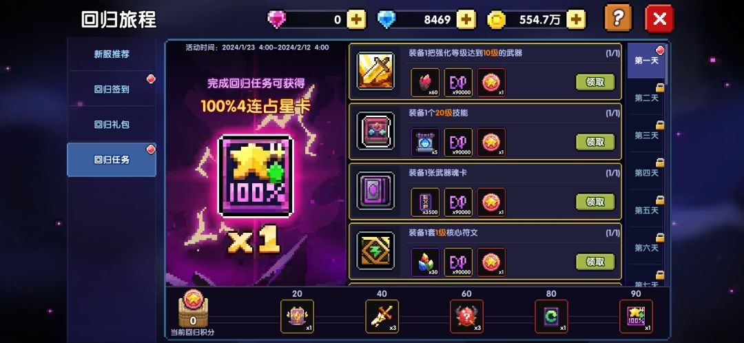 分为7天签到奖励和14天回归任务,完成签到和每日任务后即可获得: