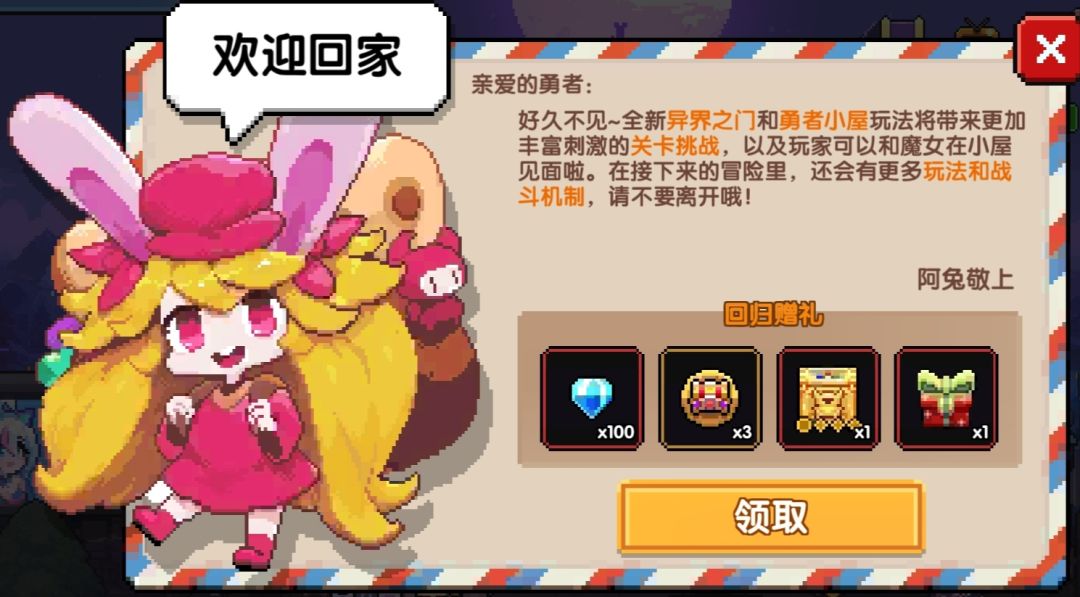 其中阿兔回归礼、7天签到奖励,两星期(满14天)没上线,且勇者等级到达D++的玩家即可解锁