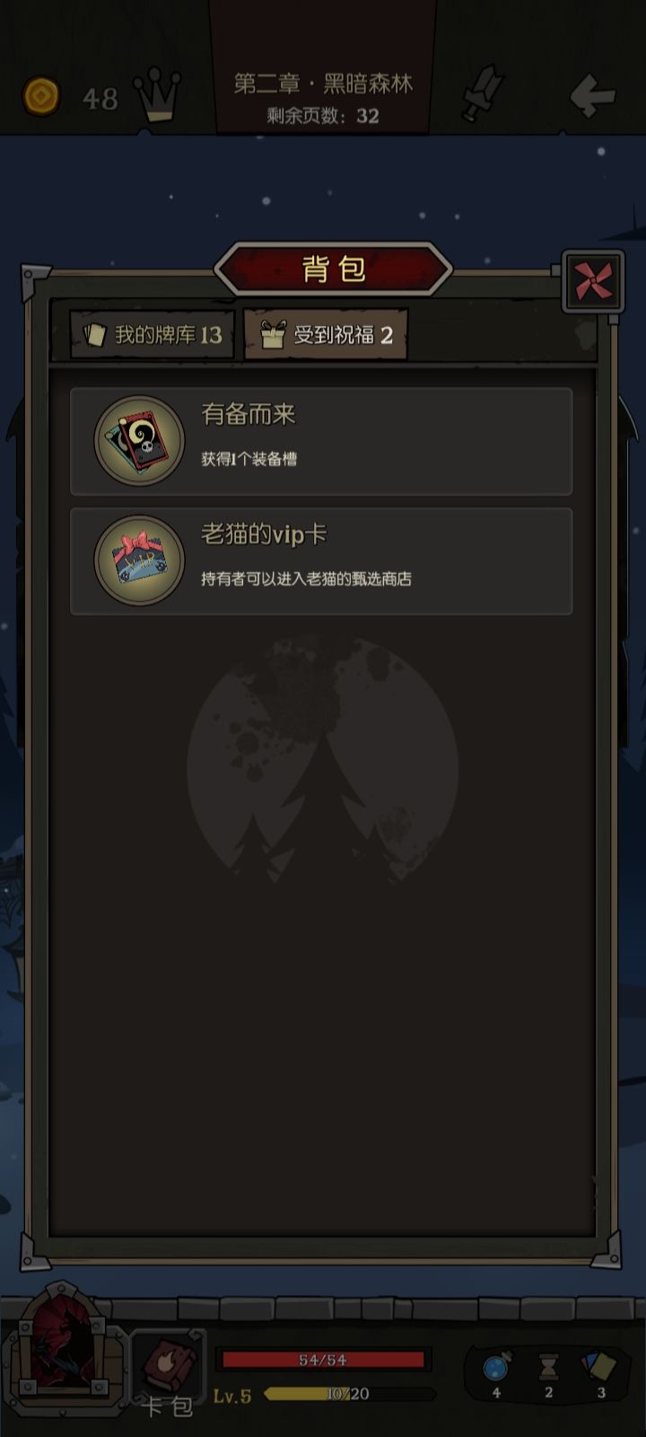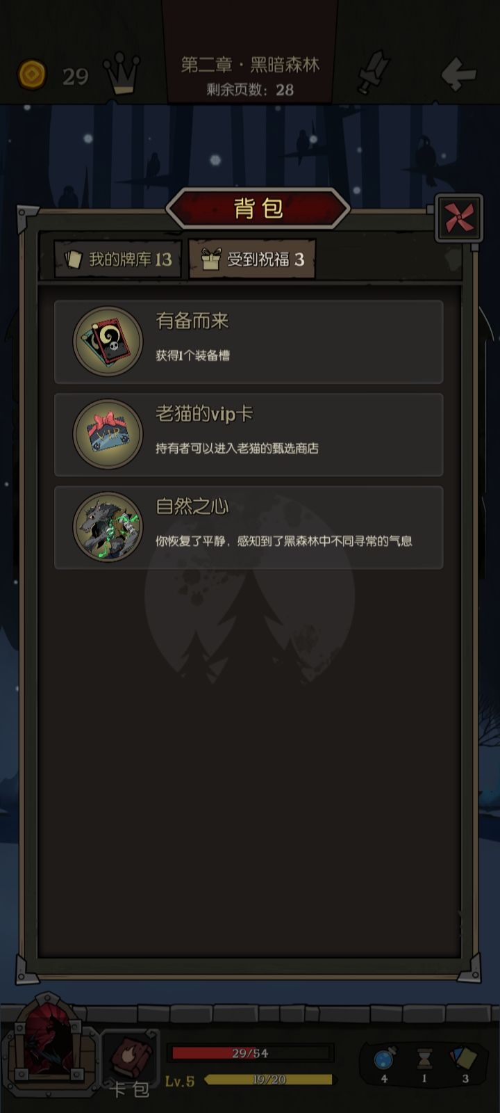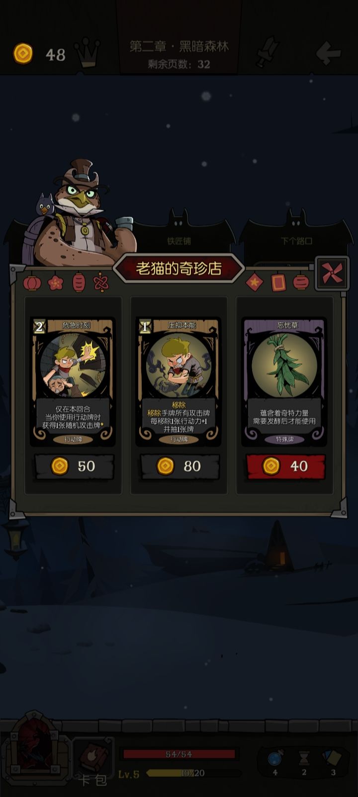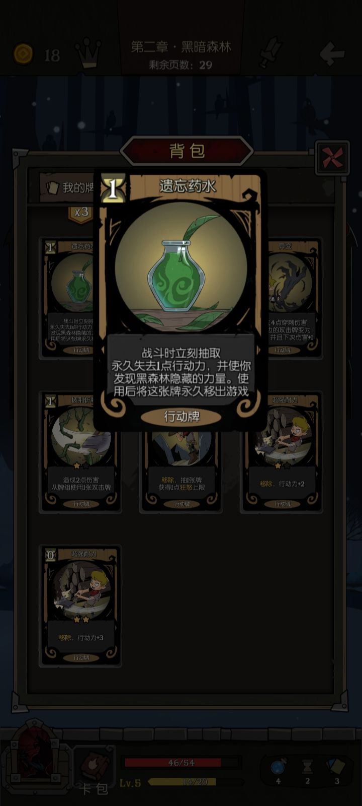 在二章是仙女祝福选择vip卡,在遇到珍奇商店时购买忘忧草,然后在酒馆处移除,获得遗忘药水,最后在战斗中喝下就行了(喝着会行动力永久-1,温馨提示,建议有3点初始行动力时再喝,我喝完就剩一点行动力了,打的非常难受