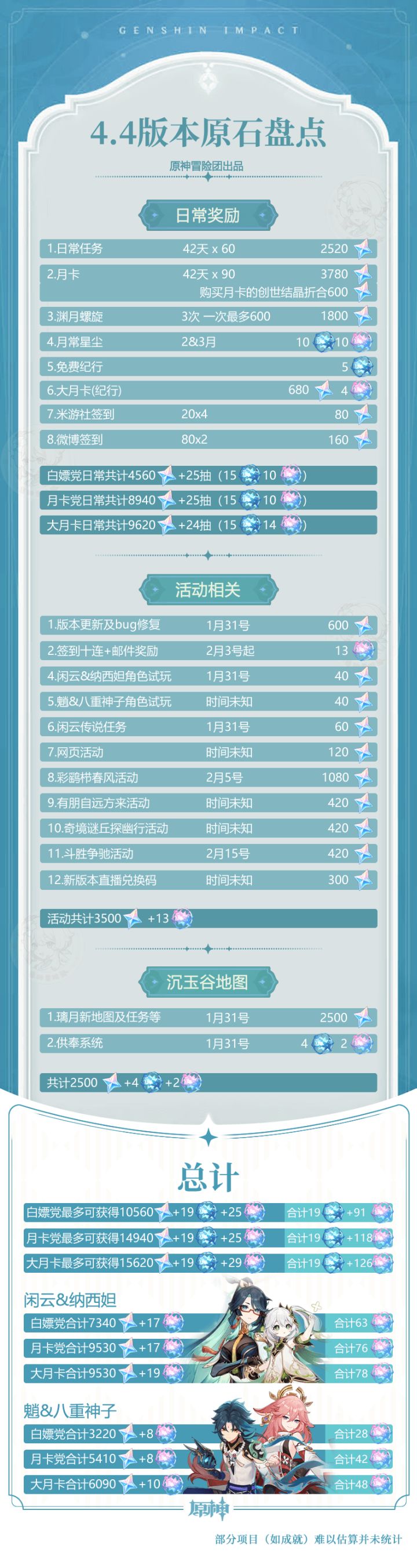2、1月31号版本更新,在统计中2月和3月的星辰商店作为项目参与统计。下版本直播的300原石兑换码放出时还在4.4版本,因此也计算到统计中。